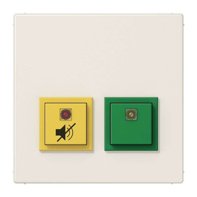 (Schraubbefestigung, ohne Befestigungskrallen) ohne Rahmen Die Dienstzimmereinheit kann zusätzlich zu den Komponenten des Notrufsets installiert werden, z.B. in einem Personal- oder Empfangsraum. Eine grüne Taste markiert die Anwesenheit, eine gelbe Taste unterdrückt das akustische Notrufsignal des Rufmoduls für 20 Sekunden. Material: Thermoplast