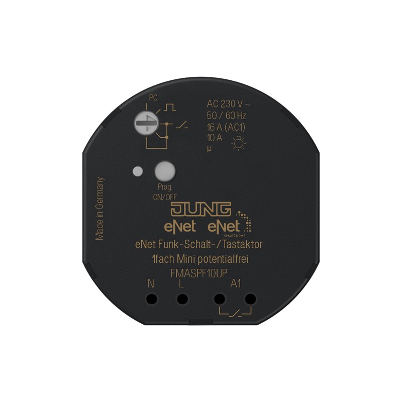 Bestimmungsgemäßer Gebrauch Schalten von Beleuchtung Bedienung mit geeigneten eNet-Funksendern Montage in Gerätedose mit Abmessungen nach DIN 49073 in Kombination mit einer geeigneten Abdeckung Montage in Aufputzgehäuse oder Einbauadapter Mini-Gehäuse (Art.-Nr. FM-EBG) für Zwischendecken Produkteigenschaften Betriebsartenschalter zur Schalt-/Tastaktor-Umschaltung oder Parametrierung über eNet-Server Statusrückmeldung an Funksender Szenenbetrieb möglich Ausgang mit Taste Prog schaltbar Statusanzeige mit LED Schaltbetrieb: Einschalttelegramm: Gerät schaltet ein Ausschalttelegramm: Gerät schaltet aus Tastbetrieb: Der Relaiskontakt bleibt so lange geschlossen wie Ein- oder Ausschalttelegramme empfangen werden Die maximale Einschaltdauer beträgt 60 Sekunden Mit eNet-Server einstellbar: Blinkfunktion Nachlaufzeit Ein-/ Ausschaltverzögerung Schließer- oder Öffnerbetrieb Abschaltwarnung Minimale Schaltwiederholzeit Bediensperren Dauer-Ein, Dauer-Aus Zusatzfunktionen mit eNet-Server: Vollverschlüsselte Funkübertragung (AES-CCM) ab eNet Server Softwareversion 2.0 Update der Gerätesoftware Repeaterfunktion Fehlerspeicher auslesen Nennspannung: AC 230 V ~ Netzfrequenz: 50/60 Hz Umgebungstemperatur: -25 ... +70 °C Schaltstrom bei 35 °C Ohmsch: 16 A (AC1) Bei Schaltstrom > 10 A Anschlussleitung 2,5 mm2 Leuchtstofflampen: 4 AX Kontaktart: µ Standby-Leistung: 0,5 W Anschlussleistung bei 35 °C Glühlampen: 2300 W HV-Halogenlampen: 2000 W Elektronische Trafos: 1500 W Induktive Trafos: 1000 VA HV-LED-Lampen: typ. 500 W Kompaktleuchtstofflampen: typ. 500 W Leuchtstofflampen unkompensiert: 920 VA Kapazitive Last: 690 VA (560 µF) Anschlussart: Schraubklemmen eindrähtig: 1 x 0,75 ... 4 mm2 feindrähtig mit Aderendhülse: 1 x 0,75 ... 2,5 mm2 Maße (Ø x H): 53 x 28 mm Funkfrequenz: 868,0 ... 868,6 MHz Sendeleistung: max. 20 mW Sendereichweite im Freifeld: typ. 100 m Empfängerkategorie: 2