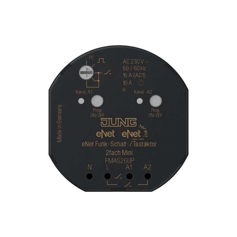Bestimmungsgemäßer Gebrauch Schalten von Beleuchtung und einphasigen Motoren Bedienung mit geeigneten eNet-Funksendern Montage in Gerätedose mit Abmessungen nach DIN 49073 in Kombination mit einer geeigneten Abdeckung Montage in Aufputzgehäuse oder Einbauadapter Mini-Gehäuse (Art.-Nr. FM-EBG) für Zwischendecken Produkteigenschaften Betriebsartenschalter zur Schalt-/Tastaktor-Umschaltung gemeinsam für beide Ausgänge oder Parametrierung über eNet-Server Unabhängiges Schalten zweier elektrischer Lasten Statusrückmeldung an Funksender Szenenbetrieb möglich Statusanzeige mit LED Schaltbetrieb: Einschalttelegramm: Gerät schaltet ein Ausschalttelegramm: Gerät schaltet aus Tastbetrieb: Der Relaiskontakt bleibt so lange geschlossen wie Ein- oder Ausschalttelegramme empfangen werden Die maximale Einschaltdauer beträgt 60 Sekunden Mit eNet-Server für jeden Ausgang einstellbar: Blinkfunktion Nachlaufzeit Ein-/ Ausschaltverzögerung Schließer- oder Öffnerbetrieb Abschaltwarnung Minimale Schaltwiederholzeit Bediensperren Dauer-Ein, Dauer-Aus Zusatzfunktionen mit eNet-Server: Vollverschlüsselte Funkübertragung (AES-CCM) ab eNet Server Softwareversion 2.0 Update der Gerätesoftware Repeaterfunktion Fehlerspeicher auslesen Nennspannung: AC 230 V ~ Netzfrequenz: 50/60 Hz Umgebungstemperatur: -25 ... +70 °C Schaltstrom bei 35 °C Ohmsch: 16 A (AC1) Bei Schaltstrom > 10 A Anschlussleitung 2,5 mm2 Strombelastbarkeit Gerät: S 16 A Leuchtstofflampen: 4 AX Kontaktart: µ Standby-Leistung: max. 0,5 W Anschlussleistung pro Ausgang bei 35 °C Glühlampen: 2300 W HV-Halogenlampen: 2000 W Elektronische Trafos: 1500 W Induktive Trafos: 1000 VA HV-LED-Lampen: typ. 500 W Kompaktleuchtstofflampen: typ. 500 W Leuchtstofflampen unkompensiert: 920 VA Motoren: 450 VA Kapazitive Last: 690 VA (560 µF) Anschlussart: Schraubklemmen eindrähtig: 1 x 0,75 ... 4 mm2 feindrähtig mit Aderendhülse: 1 x 0,75 ... 2,5 mm2 Maße (Ø x H): 53 x 28 mm Funkfrequenz: 868,0 ... 868,6 MHz Sendeleistung: max. 20 mW Sendereichweite im Freifeld: typ. 100 m Empfängerkategorie: 2