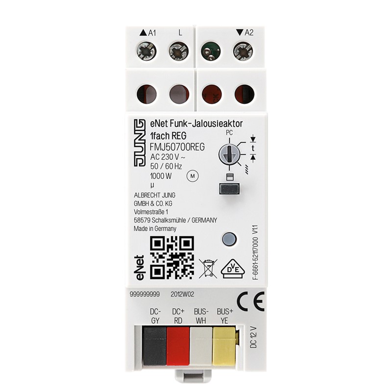 REG-Gehäuse 2 TE Bestimmungsgemäßer Gebrauch Steuern elektrisch betriebener Jalousien, Rollläden und Markisen Bedienung mit geeigneten eNet-Funksendern Betrieb mit Netzteil 12 V REG (Art.-Nr. NT 1220 REG VDC) und eNet Funk-Empfangsmodul REG (Art.-Nr. FM FK 32 REG) oder eNet-Server Montage auf Hutschiene nach DIN EN 60715 in Unterverteiler Produkteigenschaften Betriebsartenschalter zur Umschaltung auf Jalousieaktor, Rollladenaktor oder Parametrierung über eNet-Server Positionierung von Jalousie und Lamelle über Szenenaufruf Position für Sonnenschutz und Dämmerung speicherbar Statusrückmeldung an Funksender Ausgang mit Taste Prog schaltbar Behanglaufzeit speicherbar Lamellenumsteuerzeit speicherbar Tuchstraffung bei Markisen Statusanzeige mit LED Mit eNet-Server einstellbar: Umsteuerzeit bei Richtungswechsel Laufrichtung invertierbar Bediensperren Position für Sonnenschutz, Dämmerung, Aussperrschutz und Windalarm Zusatzfunktionen mit eNet-Server: Vollverschlüsselte Funkübertragung (AES-CCM) ab eNet Server Softwareversion 2.0 Update der Gerätesoftware Fehlerspeicher auslesen Nennspannung: AC 230 V ~ Netzfrequenz: 50/60 Hz Umgebungstemperatur: -5 ... +45 °C Minimale Ansteuerzeit in Betriebsart Jalousie: 0,1 s Rollladen: 0,3 s Kontaktart: µ Standby-Leistung: max. 0,2 W Laufzeit: 1 ... 600 s Werkseinstellung Laufzeit: 120 s Lamellenverstellzeit: 0 ... 10 s Anschlussleistung Motoren: 1000 W Anschluss Lastklemmen: Schraubklemmen eindrähtig: 1 x 1,5 ... 4 mm2 feindrähtig ohne Aderendhülse: 1 x 0,75 ... 4 mm2 feindrähtig mit Aderendhülse: 1 x 0,5 ... 2,5 mm2 Einbaubreite: 36 mm (2 TE) Busleitung Nennspannung: DC 12 V SELV Stromaufnahme: max. 20 mA Anschluss Bus: Anschlussklemme Leitungslänge: max. 3 m- Hersteller-Artikelnummer (MPN)
