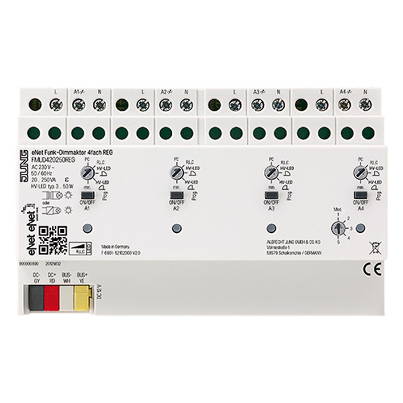 REG-Gehäuse 8 TE Bestimmungsgemäßer Gebrauch Schalten und Dimmen von Glühlampen, HV-Halogenlampen, elektronischen Trafos für Halogen- oder LED-Lampen, dimmbaren induktiven Trafos für Halogen- oder LED-Lampen, HV-LED- oder Kompaktleuchtstofflampen Betrieb mit Netzteil 12 V REG (Art.-Nr. NT 1220 REG VDC) und eNet Funk-Empfangsmodul REG (Art.-Nr. FM FK 32 REG) oder eNet-Server Bedienung mit geeigneten eNet-Funksendern Montage auf Hutschiene nach DIN EN 60715 in Unterverteiler Produkteigenschaften Einschalten durch lampenschonenden Softstart Einschalthelligkeit für jeden Ausgang dauerhaft speicherbar Minimalhelligkeit für jeden Ausgang dauerhaft speicherbar Szenenbetrieb möglich Statusanzeige der Ausgänge über LED Statusrückmeldung an Funksender Ausgänge mit Taste Prog schaltbar Erhöhung der Ausgangsleistung durch Parallelschalten mehrerer Ausgänge möglich Elektronischer Kurzschlussschutz mit dauerhafter Abschaltung spätestens nach 7 Sekunden Elektronischer Übertemperaturschutz Automatische oder manuelle Einstellung des zur Last passenden Dimmprinzips Leistungserweiterung durch Leistungszusätze (Art.-Nr. ULZ 1755 REG) möglich Optionales Zubehör: Kompensationsmodul LED, Art.-Nr.: KM LED 230 U Mit eNet-Server einstellbar: Maximalhelligkeit Dimmgeschwindigkeit Ein-/ Ausschaltverzögerung Auf-/ Abdimmrampe Abschaltwarnung Bediensperren Dauer-Ein, Dauer-Aus Hotelfunktion Nachlaufzeit Zusatzfunktionen mit eNet-Server: Vollverschlüsselte Funkübertragung (AES-CCM) ab eNet Server Softwareversion 2.0 Update der Gerätesoftware Fehlerspeicher auslesen Nennspannung: AC 230 V ~, 50/60 Hz Verlustleistung: max. 8 W Standby-Leistung: max. 1,2 W Umgebungstemperatur: -5 ... +45 °C Anschlussleistung pro Ausgang bei 45 °C Leistungsangaben einschließlich Trafoverlustleistung. Induktive Trafos mit mindestens 85 % Nennlast betreiben. Bei ohmsch-induktiver Mischlast max. 50 % Anteil ohmsche Last. Andernfalls kann es zu falschem Einmessen des Dimmers kommen. Parallelgeschaltete Lastausgänge jeweils nur bis 95 % auslasten. Die Mindestlast beim Parallelschalten von Lastausgängen beträgt 250 VA. Glühlampen: 20 ... 250 W HV-Halogenlampen: 20 ... 250 W Elektronische Trafos: 20 ... 250 W Elektronische Trafos mit NV-LED: typ. 20 ... 100 W Induktive Trafos: 20 ... 250 VA Induktive Trafos mit NV-LED: typ. 20 ... 100 VA HV-LED-Lampen dimmbar: typ. 3 ... 50 W Kompaktleuchtstofflampen dimmbar: typ. 3 ... 50 W Bei Einstellung "LED-Phasenabschnitt" verdoppelt sich die maximale Anschlussleistung für HV-LED-Lampen und elektronische Trafos mit NV-LED. Ohmsch-induktiv: 20 ... 250 VA Ohmsch-kapazitiv: 20 ... 250 VA Kapazitiv-induktiv: nicht zulässig Leistungszusätze: siehe Anleitung Leistungszusatz Anschluss Ausgänge Anschlussart: Schraubklemmen eindrähtig: 1 x 1,5 ... 4 mm2 feindrähtig ohne Aderendhülse: 1 x 0,75 ... 4 mm2 feindrähtig mit Aderendhülse: 1 x 0,5 ... 2,5 mm2 Kontaktart: e Länge Lastleitung pro Kanal: max. 100 m Einbaubreite: 144 mm (8 TE) Busleitung Nennspannung: DC 12 V SELV Stromaufnahme: 10 mA Anschluss Bus: Anschlussklemme Leitungslänge: max. 3 m- Hersteller-Artikelnummer (MPN)