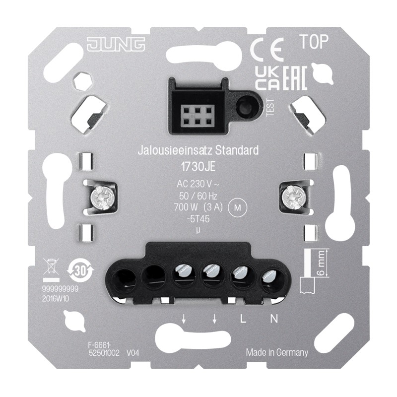 ohne Nebenstelleneingang für Aufsätze JUNG HOME Art.-Nrn.: BT .. 17101 .., BT .. 17102 .. für Aufsätze eNet Art.-Nrn.: FM .. 1700 .., FM .. 1701 .. für Aufsätze LB-Management Art.-Nrn.: .. 1700 .., .. 1750 D .. für Aufsätze KNX RF Art.-Nrn.: .. 1091 1ST RF .., .. 1092 1ST RF .. Bestimmungsgemäßer Gebrauch Steuern elektrisch betriebener Jalousien, Rollläden und Markisen Automatische Zeitsteuerung über Aufsatz Betrieb mit geeignetem Aufsatz Montage in Gerätedose mit Abmessungen nach DIN 49073 Produkteigenschaften Automatische Steuerung über Timer Testbetrieb zur Funktionsprüfung Umpolfunktion der Ausgänge zur vereinfachten Inbetriebnahme Speicherung einer Lüftungsposition über den Aufsatz möglich Nennspannung: AC 230 V ~ Netzfrequenz: 50/60 Hz Umgebungstemperatur: -5 ... +45 °C Kontaktart: µ Standby-Leistung: max. 0,5 W Laufzeit: ca. 120 s Anschlussleistung Motoren: 700 W Anschluss Anschlussart: Schraubklemmen eindrähtig: 1 x 0,5 ... 4,0 mm2 2 x 0,5 ... 2,5 mm2 feindrähtig ohne Aderendhülse: 1 x 0,5 ... 4,0 mm2 2 x 0,5 ... 2,5 mm2 feindrähtig mit Aderendhülse: 1 x 0,5 ... 4,0 mm22 x 0,5 ... 1,5 mm2