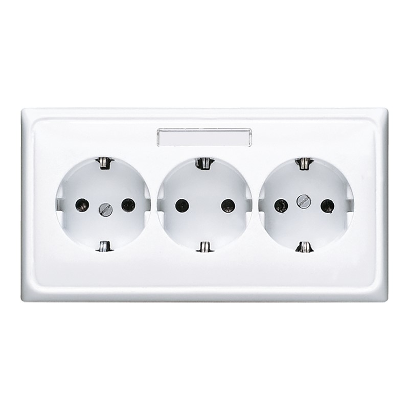 3fach mit 1 Schriftfeld 6 x 37 mm über mittlerer Steckdose mit Federklemmen für starre Leiter bis 2,5 mm2 Verbindungsklemmen nach DIN VDE 0620 mit integriertem Rahmen zum Einsatz in handelsübliche Kanaldosen Maße: 80 x 151 mm Ersatzteil: Transparente Abdeckung mit Einlage Art.-Nr.: CD 20 NA Material: Duroplast