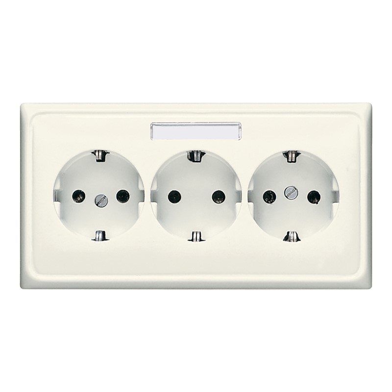 3fach mit 1 Schriftfeld 6 x 37 mm über mittlerer Steckdose mit Federklemmen für starre Leiter bis 2,5 mm2 Verbindungsklemmen nach DIN VDE 0620 mit integriertem Rahmen zum Einsatz in handelsübliche Kanaldosen Maße: 80 x 151 mm Ersatzteil: Transparente Abdeckung mit Einlage Art.-Nr.: CD 20 NA Material: Duroplast