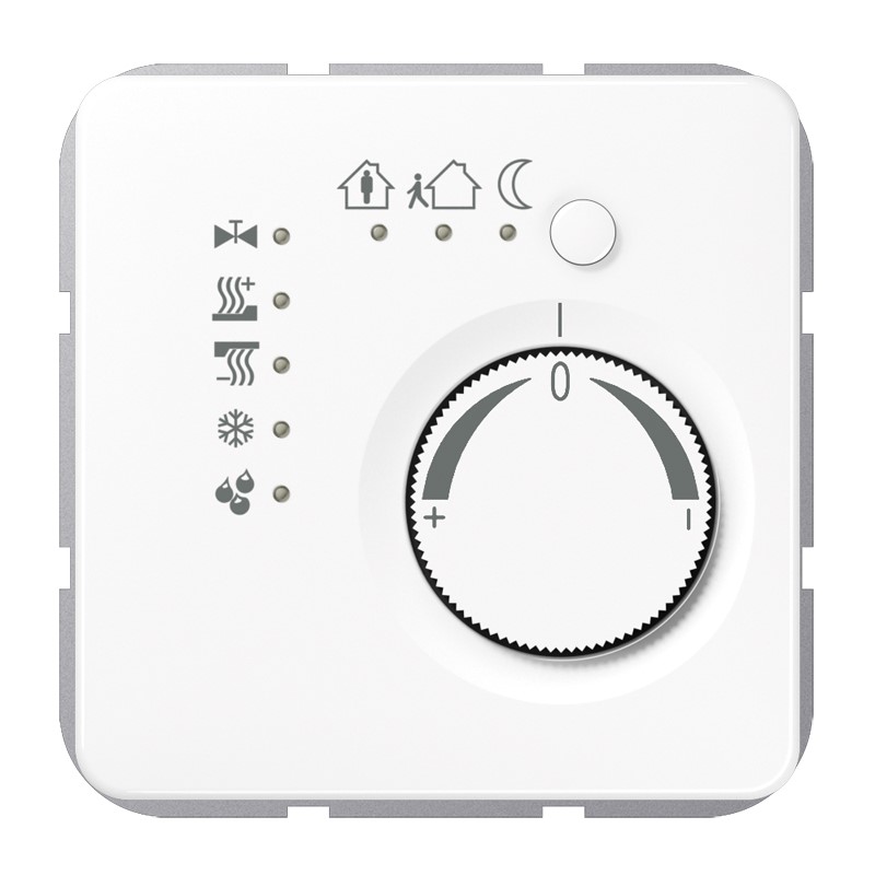 mit Stellrad zur Sollwertverstellung Die volle Funktionalität wird ab ETS3.0d oder höher unterstützt. ETS-Produktfamilie Phys. Sensoren Produkttyp Temperatur Bestimmungsgemäßer Gebrauch Einzelraum-Temperaturregelung in KNX-Installationen Montage in Gerätedose mit Abmessungen nach DIN 49073 Produkteigenschaften Integrierter Busankoppler Messung der Raumtemperatur und Vergleich mit Soll-Temperatur Sollwert-Vorgabe durch Wahl der Betriebsart Betriebsarten Komfort, Standby, Nachtbetrieb, Frost-/Hitzeschutz Heiz- und Kühlbetrieb Heizen und Kühlen mit Grund- und Zusatzstufe Stellrad zur Sollwert-Korrektur Präsenz-Taste Status-LEDs KNX Medium: TP 256 Nennspannung KNX: DC 21 ... 32 V SELV Stromaufnahme KNX: max. 10 mA Anschluss KNX: Anschlussklemme Umgebungstemperatur: -5 ... +45 °C Lager-/Transporttemperatur: -25 ... +70 °C