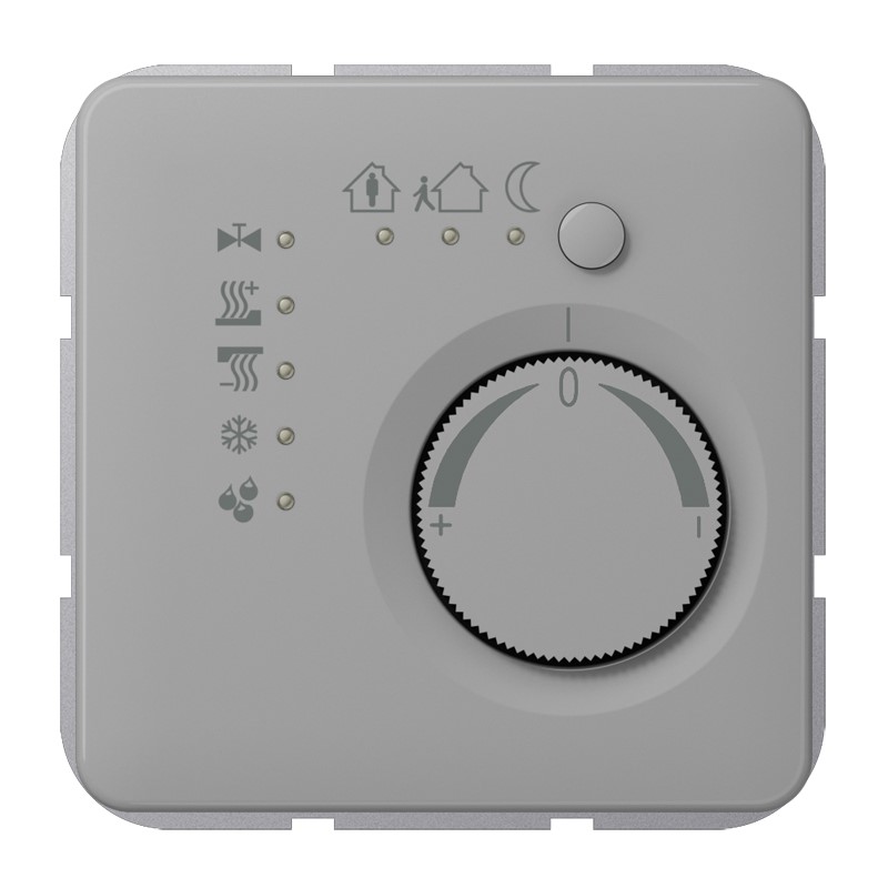 mit Stellrad zur Sollwertverstellung Die volle Funktionalität wird ab ETS3.0d oder höher unterstützt. ETS-Produktfamilie Phys. Sensoren Produkttyp Temperatur Bestimmungsgemäßer Gebrauch Einzelraum-Temperaturregelung in KNX-Installationen Montage in Gerätedose mit Abmessungen nach DIN 49073 Produkteigenschaften Integrierter Busankoppler Messung der Raumtemperatur und Vergleich mit Soll-Temperatur Sollwert-Vorgabe durch Wahl der Betriebsart Betriebsarten Komfort, Standby, Nachtbetrieb, Frost-/Hitzeschutz Heiz- und Kühlbetrieb Heizen und Kühlen mit Grund- und Zusatzstufe Stellrad zur Sollwert-Korrektur Präsenz-Taste Status-LEDs KNX Medium: TP 256 Nennspannung KNX: DC 21 ... 32 V SELV Stromaufnahme KNX: max. 10 mA Anschluss KNX: Anschlussklemme Umgebungstemperatur: -5 ... +45 °C Lager-/Transporttemperatur: -25 ... +70 °C