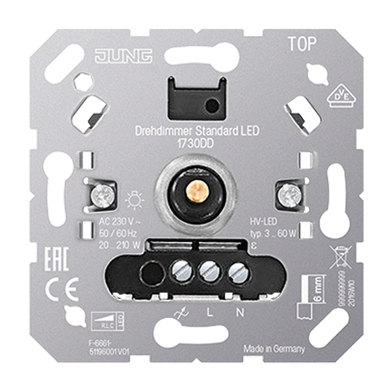 Bestimmungsgemäßer Gebrauch Schalten und Dimmen von Beleuchtung Betrieb mit geeigneter Abdeckung Montage in Gerätedose mit Abmessungen nach DIN 49073 Produkteigenschaften Gerät arbeitet nach dem Phasenan- oder Phasenabschnittprinzip Automatische Einstellung des zur Last passenden Dimmprinzips Gerät kann ohne Neutralleiter betrieben werden Einschalten durch lampenschonenden Softstart Einschalten mit zuletzt eingestellter Helligkeit oder gespeicherter Einschalthelligkeit Einschalthelligkeit dauerhaft speicherbar Minimalhelligkeit dauerhaft speicherbar Maximalhelligkeit dauerhaft speicherbar Elektronischer Kurzschlussschutz mit dauerhafter Abschaltung spätestens nach 7 Sekunden Elektronischer Übertemperaturschutz Leistungserweiterung durch Leistungszusätze (Art.-Nr. ULZ 1755 REG) möglich Optionales Zubehör: Kompensationsmodul LED, Art.-Nr.: KM LED 230 U mit Inkrementalgeber ohne Nebenstelleneingang Nennspannung: AC 230 V ~ Netzfrequenz: 50/60 Hz Standby-Leistung: ca. 0,35 W Verlustleistung: ca. 2 W Umgebungstemperatur: -5 ... +45 °C Anschlussleistung bei 25 °C Glühlampen: 20 ... 210 W HV-Halogenlampen: 20 ... 210 W Elektronische Trafos: 20 ... 210 W Elektronische Trafos mit NV-LED: typ. 20 ... 60 W Induktive Trafos: 20 ... 210 VA Induktive Trafos mit NV-LED: typ. 20 ... 60 VA HV-LED-Lampen dimmbar: typ. 3 ... 60 W Kompaktleuchtstofflampen dimmbar: typ. 3 ... 60 W Ohmsch-kapazitiv: 20 ... 210 W Kapazitiv-induktiv: nicht zulässig Ohmsch-induktiv: 20 ... 210 VA Ohmsch und HV-LED: typ. 3 ... 60 W Ohmsch und Kompaktleuchtstoffl.: typ. 3 ... 60 W Betrieb ohne Neutralleiter: Mindestlast 50 W. Gilt nicht für Lasten mit HV-LED- und Kompaktleuchtstofflampen. Leistungszusätze: siehe Anleitung Leistungszusatz Anschluss Schraubklemmen eindrähtig: 1 x 0,5 ... 4,0 mm2 2 x 0,5 ... 2,5 mm2 feindrähtig ohne Aderendhülse: 1 x 0,5 ... 4,0 mm2 2 x 0,5 ... 2,5 mm2 feindrähtig mit Aderendhülse: 1 x 0,5 ... 4,0 mm22 x 0,5 ... 1,5 mm2 Gesamtlänge Lastleitung: max. 100 m- Hersteller-Artikelnummer (MPN)