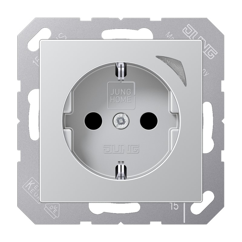 JUNG HOME Schutzkontakt® Steckdose Energy, aluminium mit integriertem erhöhten Berührungsschutz (Safety Plus) mit Schraubklemmen für starre und flexible Leiter bis 2,5 mm2 Verbindungsklemmen nach DIN VDE 0620 Tragring, Krallen und Krallenschrauben sind über eine Erdungsschiene in die Schutzmaßnahme eingebunden. Bestimmungsgemäßer Gebrauch Manuelles oder automatisches Schalten von Beleuchtung und haushaltsüblichen Geräten Leistungs- (W) und Energiemessung (kWh) der angeschlossenen Geräte Drahtlose Verknüpfung mit Geräten des JUNG HOME Systems Einsatz im trockenen Innenbereich Montage in Gerätedose mit Abmessungen nach DIN 49073 Tiefe der Gerätedose (Innenmaß): min. 53 mm Produkteigenschaften Inbetriebnahme und Bedienung über JUNG HOME App mit mobilem Endgerät (Smartphone oder Tablet) über Bluetooth® Taste zum Schalten Mehrfarbige Statusanzeige mit optionalem Nachtmodus Sperren der lokalen Bedienung Bis zu 16 Zeitprogramme Ein-/ Ausschaltverzögerung Einbindung der Last in Bereiche (Gruppen), Zentralfunktionen und Szenen Automatikfunktionen aktivieren/deaktivieren über JUNG HOME App Sperr- und Zwangsführung: Dauer-EIN/AUS oder für feste Zeit EIN/AUS Automatische Datum- und Uhrzeitaktualisierung bei Verbindung mit mobilem Endgerät Zeitprogramme mit Sonnenauf- bzw. Sonnenuntergang (Astrotimer) Integrierter Schaltaktor mit 16 A Leistungsmessung von 0,1 bis 3680 Watt und Energiemessung (kWh) Aufzeichnung des Energieverlaufes letzte 24 Stunden und letzte 31 Tage (Charting) Betriebsstundenzähler, Zeitraum der Energiemessung Power-Save-Funktion (Abschalten von Standby-Verbrauchern) Master-Slave-Funktion (abhängig vom angeschlossenen Verbraucher einen drahtlos verknüpften Verbraucher schalten) Überstrom-Schutzabschaltung Bluetooth® Mesh für voll verschlüsselte drahtlose Kommunikation und Repeaterfunktion Updatefähig über JUNG HOME App Zukünftig per Update verfügbar: (Hinweise zu Updates und Terminen finden sie unter jung.group/junghome) Eingespeiste Leistung von -0,1 bis -3680 Watt und eingespeiste Energie (kWh) Material: Thermoplast lackiert Maße (B x H): 55 x 55 mm