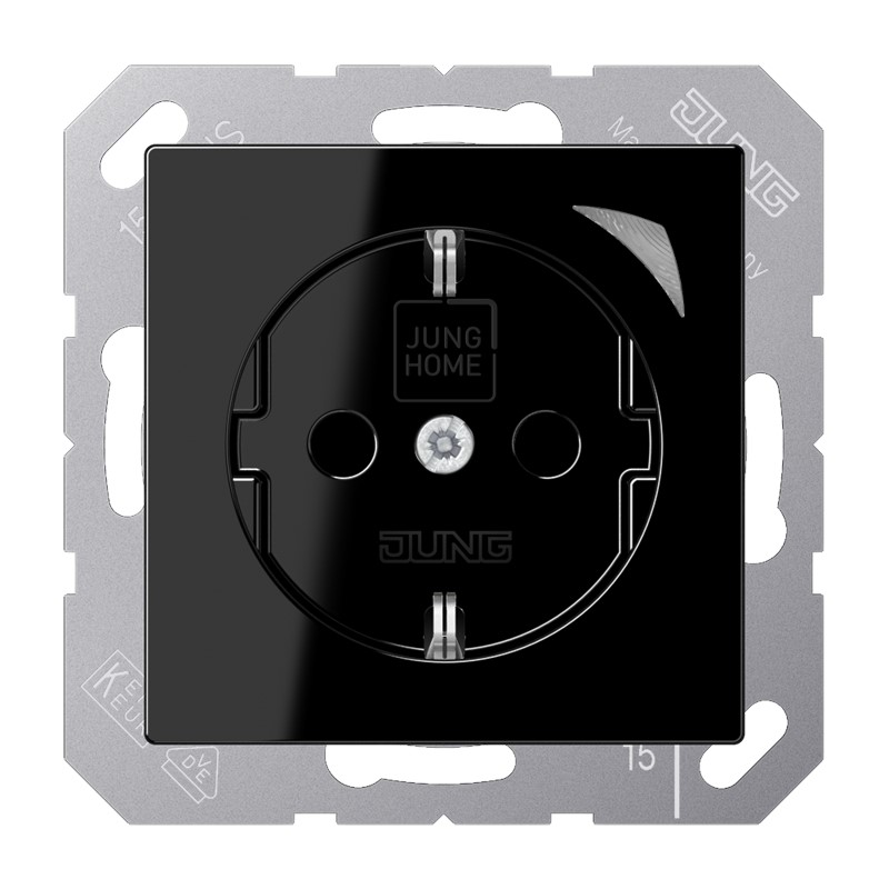 JUNG HOME Schutzkontakt® Steckdose Energy, schwarz mit integriertem erhöhten Berührungsschutz (Safety Plus) mit Schraubklemmen für starre und flexible Leiter bis 2,5 mm2 Verbindungsklemmen nach DIN VDE 0620 Tragring, Krallen und Krallenschrauben sind über eine Erdungsschiene in die Schutzmaßnahme eingebunden. Bestimmungsgemäßer Gebrauch Manuelles oder automatisches Schalten von Beleuchtung und haushaltsüblichen Geräten Leistungs- (W) und Energiemessung (kWh) der angeschlossenen Geräte Drahtlose Verknüpfung mit Geräten des JUNG HOME Systems Einsatz im trockenen Innenbereich Montage in Gerätedose mit Abmessungen nach DIN 49073 Tiefe der Gerätedose (Innenmaß): min. 53 mm Produkteigenschaften Inbetriebnahme und Bedienung über JUNG HOME App mit mobilem Endgerät (Smartphone oder Tablet) über Bluetooth® Taste zum Schalten Mehrfarbige Statusanzeige mit optionalem Nachtmodus Sperren der lokalen Bedienung Bis zu 16 Zeitprogramme Ein-/ Ausschaltverzögerung Einbindung der Last in Bereiche (Gruppen), Zentralfunktionen und Szenen Automatikfunktionen aktivieren/deaktivieren über JUNG HOME App Sperr- und Zwangsführung: Dauer-EIN/AUS oder für feste Zeit EIN/AUS Automatische Datum- und Uhrzeitaktualisierung bei Verbindung mit mobilem Endgerät Zeitprogramme mit Sonnenauf- bzw. Sonnenuntergang (Astrotimer) Integrierter Schaltaktor mit 16 A Leistungsmessung von 0,1 bis 3680 Watt und Energiemessung (kWh) Aufzeichnung des Energieverlaufes letzte 24 Stunden und letzte 31 Tage (Charting) Betriebsstundenzähler, Zeitraum der Energiemessung Power-Save-Funktion (Abschalten von Standby-Verbrauchern) Master-Slave-Funktion (abhängig vom angeschlossenen Verbraucher einen drahtlos verknüpften Verbraucher schalten) Überstrom-Schutzabschaltung Bluetooth® Mesh für voll verschlüsselte drahtlose Kommunikation und Repeaterfunktion Updatefähig über JUNG HOME App Zukünftig per Update verfügbar: (Hinweise zu Updates und Terminen finden sie unter jung.group/junghome) Eingespeiste Leistung von -0,1 bis -3680 Watt und eingespeiste Energie (kWh) Material: Thermoplast Maße (B x H): 55 x 55 mm