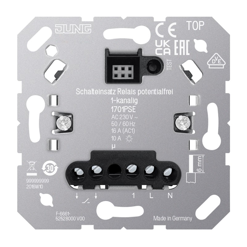 mit Nebenstelleneingang für Aufsätze JUNG HOME Art.-Nrn.: BT .. 17101 .., BT .. 17102 .., BT .. 17181 .., BT .. 17182 .., BT .. 1791 .., BT 17361 .. für Aufsätze eNet Art.-Nrn.: FM .. 1700 .., FM .. 1701 .. für Aufsätze LB-Management Art.-Nrn.: .. 1700 .., .. 1750 D .., .. 17180 .., .. 17280 .., .. 1790 D .. (ab Version V03) für Aufsätze KNX RF Art.-Nrn.: .. 1091 1ST RF .., .. 1092 1ST RF .. Bestimmungsgemäßer Gebrauch Schalten von potentialgetrennten Stromkreisen für Beleuchtungen Steuern von elektrischen Fußbodenheizungen und elektrothermischen Stellantrieben in Kombination mit einem Raumtemperaturregler-Aufsatz oder KNX RF Taster Betrieb mit geeignetem Aufsatz Montage in Gerätedose mit Abmessungen nach DIN 49073 Produkteigenschaften Anschluss von Nebenstellen möglich Zeitfunktion einstellbar Nennspannung: AC 230 V ~ Netzfrequenz: 50/60 Hz Standby-Leistung abhängig vom Aufsatz: ca. 0,1 ... 0,5 W Umgebungstemperatur: -25 ... +45 °C Lager-/Transporttemperatur: -20 ... +70 °C Schaltstrom bei 35 °C Bei Schaltstrom > 10 A Anschlussleitung 2,5 mm2 Ohmsch: 16 A (AC1) Leuchtstofflampen: 4 AX Anschlussleistung bei 35 °C Glühlampen: 2300 W HV-Halogenlampen: 2000 W Elektronische Trafos: 1500 W Induktive Trafos: 1000 VA HV-LED-Lampen: typ. 400 W Leuchtstofflampen unkompensiert: 920 VA Kapazitive Last: 920 VA (115 µF) Leistungsreduzierung pro 5 °C Überschreitung von 35 °C: -5 % bei Einbau in Holz- oder Trockenbauwand: -15 % bei Einbau in Mehrfachkombinationen: -20 % Anzahl Stellantriebe: 1 ... 10 Anzahl Nebenstellen Nebenstelle 2-Draht 1720 NE: unbegrenzt Taster: unbegrenzt Nebenstelle 3-Draht 1723 NE: 10 Drehnebenstelle 3-Draht 1733 DNE: 10