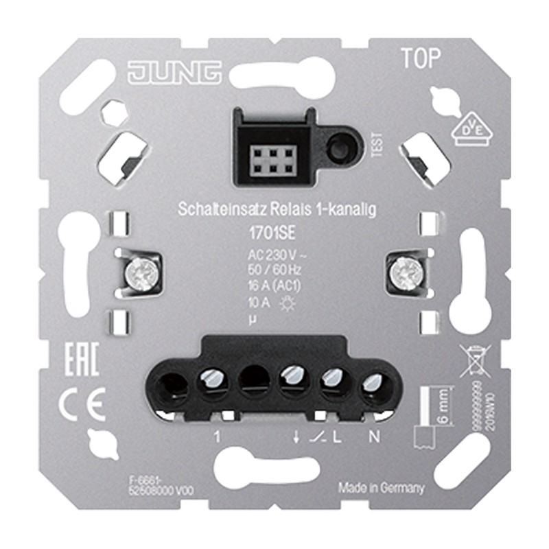 mit Nebenstelleneingang für Aufsätze JUNG HOME Art.-Nrn.: BT .. 17101 .., BT .. 17102 .., BT .. 17181 .., BT .. 17182 .., BT .. 1791 .., BT 17361 .. für Aufsätze eNet Art.-Nrn.: FM .. 1700 .., FM .. 1701 .. für Aufsätze LB-Management Art.-Nrn.: .. 1700 .., .. 1750 D .., .. 17180 .., .. 17280 .., .. 1790 D .. für Aufsätze KNX RF Art.-Nrn.: .. 1091 1ST RF .., .. 1092 1ST RF .. Bestimmungsgemäßer Gebrauch Schalten von Beleuchtung und Motoren Betrieb mit geeignetem Aufsatz Steuern von elektrischen Fußbodenheizungen und elektrothermischen Stellantrieben in Kombination mit einem Raumtemperaturregler-Aufsatz Montage in Gerätedose mit Abmessungen nach DIN 49073 Produkteigenschaften Anschluss von Nebenstellen möglich Nachlaufzeiten einstellbar Testbetrieb zur Funktionsprüfung Adaptive Nullpunktschaltung Nennspannung: AC 230 V ~ Netzfrequenz: 50/60 Hz Standby-Leistung abhängig vom Aufsatz: ca. 0,1 ... 0,5 W Schaltstrom bei 35 °C Schaltstrom Motoren: 6 A Anschlussleistung bei 35 °C Glühlampen: 2300 W HV-Halogenlampen: 2300 W Elektronische Trafos: 1500 W Induktive Trafos: 1000 VA HV-LED-Lampen: typ. 400 W Leuchtstofflampen unkompensiert: 1200 VA Kapazitive Last: 920 VA (115 µF) Anschluss Schraubklemmen eindrähtig: 1 x 0,5 ... 4,0 mm2 2 x 0,5 ... 2,5 mm2 feindrähtig ohne Aderendhülse: 1 x 0,5 ... 4,0 mm2 2 x 0,5 ... 2,5 mm2 feindrähtig mit Aderendhülse: 1 x 0,5 ... 4,0 mm22 x 0,5 ... 1,5 mm2 Einbautiefe: 24 mm Umgebungstemperatur: -25 ... +45 °C Lager-/Transporttemperatur: -20 ... +70 °C Anzahl Stellantriebe: 1 ... 10 Anzahl Nebenstellen Nebenstelle 2-Draht 1720 NE: unbegrenzt Nebenstelle 3-Draht 1723 NE: 10 Taster: unbegrenzt Nachlaufzeit: ohne, 1 min, 5 min, 30 min, 60 min