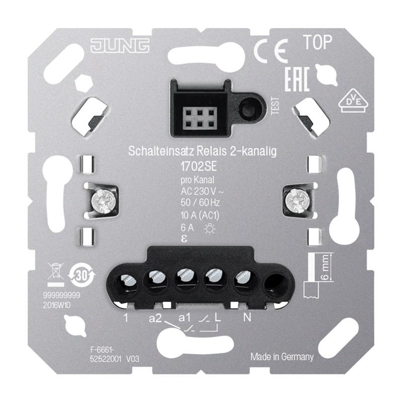 mit Nebenstelleneingang für Aufsätze JUNG HOME Art.-Nrn.: BT .. 17101 .., BT .. 17102 .., BT .. 17181 .., BT .. 17182 .., BT .. 1791 .., BT 17361 .. für Aufsätze eNet Art.-Nrn.: FM .. 1700 .., FM .. 1701 .. für Aufsätze LB-Management Art.-Nrn.: .. 1700 .., .. 1702 .., .. 1750 D .., .. 17180 .., .. 17280 .. für Aufsätze KNX RF Art.-Nrn.: .. 1091 1ST RF .., .. 1092 1ST RF .. Bestimmungsgemäßer Gebrauch Schalten von Beleuchtung und Motoren Betrieb mit geeignetem Aufsatz Montage in Gerätedose mit Abmessungen nach DIN 49073 Produkteigenschaften Anschluss von Nebenstellen möglich Testbetrieb zur Funktionsprüfung In Kombination mit LB-Management Taster 2fach: Zwei unabhängige Ausgänge Zeitfunktion für Ausgang a2 einstellbar In Kombination mit LB-Management Taster 1fach (Art.-Nrn. ..1700.., ..1701..), LB-Management Timer-Display, LB-Management Bewegungsmelder: Ausgang a2 schaltet abhängig von Ausgang a1 z.B. um eine Lüftung in Abhängigkeit der Beleuchtung einzuschalten und mit Verzögerung auszuschalten. Einschaltverzögerung für Ausgang a2 einstellbar Ausschaltverzögerung für Ausgang a2 einstellbar In Kombination mit Nebenstelle 3-Draht und LB-Management Taster 2fach: Zwei unabhängige Ausgänge In Kombination mit Nebenstelle 2-Draht, Drehnebenstelle oder Taster: Ausgang a2 schaltet abhängig von Ausgang a1 z.B. um eine Lüftung in Abhängigkeit der Beleuchtung einzuschalten und mit Verzögerung auszuschalten.