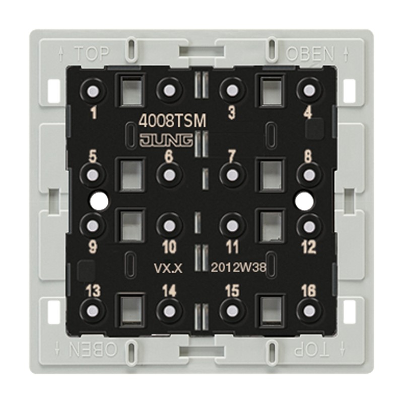 zum Anschluss an die Relaisstation (Art.-Nr. RS 8 REGHE) und die Dimmstation (Art.-Nr. UDS 4 REGHE) Produkteigenschaften 8 Kanäle der Relais- und Dimmstation ansteuerbar: Schalten, Tasten, Dimmen, Jalousie 16 Kanäle bei parallel geschalteten Stationen in Verbindung mit dem Tastsensor-Erweiterungsmodul Art.-Nr.: 4094 TSEM Alle Kanäle der Stationen sind im Auslieferungszustand schaltbar Zentralfunktion: alle ausgewählten Kanäle der Stationen werden zentral angesteuert Lichtszenen: Bis zu 4 Lichtszenen können frei konfiguriert werden Tasten sind entsprechend dem Tastensatz konfigurierbar Programmierung ohne zusätzliche Hilfsmittel Freie Zuordnung der Tasten zu den Kanälen Rote LED als Statusanzeige (abschaltbar) Blaues Orientierungslicht (abschaltbar) Rückmeldung der Schaltzustände auf allen angeschlossenen Tastsensor-Modulen und Sensormodulen Bis zu 4 Tastsensor-Module mit max. 4 Tastsensor-Erweiterungsmodulen können an eine Relaisstation angeschlossen werden (Anwendung z.B. in Wechsel- oder Kreuzschaltungen) Klonen von Tastsensor-Modulen: Übertragen der Tastenzuordnung eines Tastsensor-Moduls auf weitere Tastsensor-Module (Anwendung z.B. in Wechsel- oder Kreuzschaltungen) Klonen von Tastsensor-Modulen mit Erweiterungsmodul ist möglich Einfache Installation über 2-Draht-Leitung