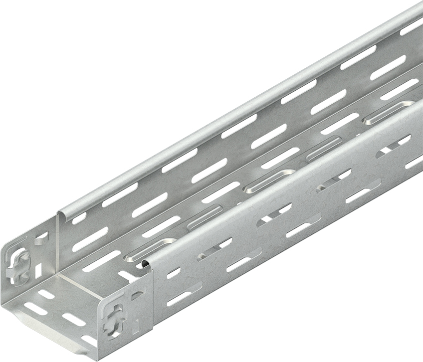 Kabelrinne, leicht, nach DIN EN 61537, mit angeprägtem Stoßstellenverbinder zur schraublosen Schnellbefestigung und mit versetzt angeordneter Boden- und Seitenperforation für stufenlose Befestigung und Anbringung der Systembauteile, Boden zusätzlich gesickt und mit durchgehend mittiger Loch- bzw. Schlüssellochperforation zur Abhängung mit Gewindestäben M 10/... bzw. M 12/... . VDE zertifiziert! Abmessungen (ca. Maße) H x B : 60 x 100 mm Materialstärke t : 0,8 mm Lochperforation : Ø 11 mm Abstand : 125 mm Schlüssellochperforation : 7 x 38 mm und Ø 12,5 mm Abstand : 125 mm Lieferlänge L : 3000 mm Nutzbarer Querschnitt : 5800 mm² Werkstoff : Edelstahl, Werkstoff Nr. 1.4301, AISI 304