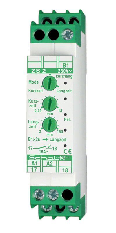 Der ZS 2 vereint als moderner Lichtzeit-Impulsschalter (Stromstoßschalter) ein hohes Maß an Komfort, Flexibilität und Funktionsvielfalt bei einfacher Handhabung und Bedienung. Durch kurzes bzw. längeres Betätigen des Lichttasters kann zwischen zwei voneinander unabhängig einstellbaren Zeitbereichen ausgewählt werden. Damit wird eine individuell konfigurierbare Kurzzeit- / Langzeitumschaltung in einem Bereich von 0,25 bis 150 Minuten ermöglicht. Durch erneute Betätigung des Lichttasters wird ein sofortiges Abschalten der Verbraucher erreicht. Zwei Betriebsarten ermöglichen ein Sperren der Langzeitumschaltung., Maße: 18x55mm, 230V AC - 1 Schließer (potenzialfrei) 16A, tvK/tvL -18/-150min