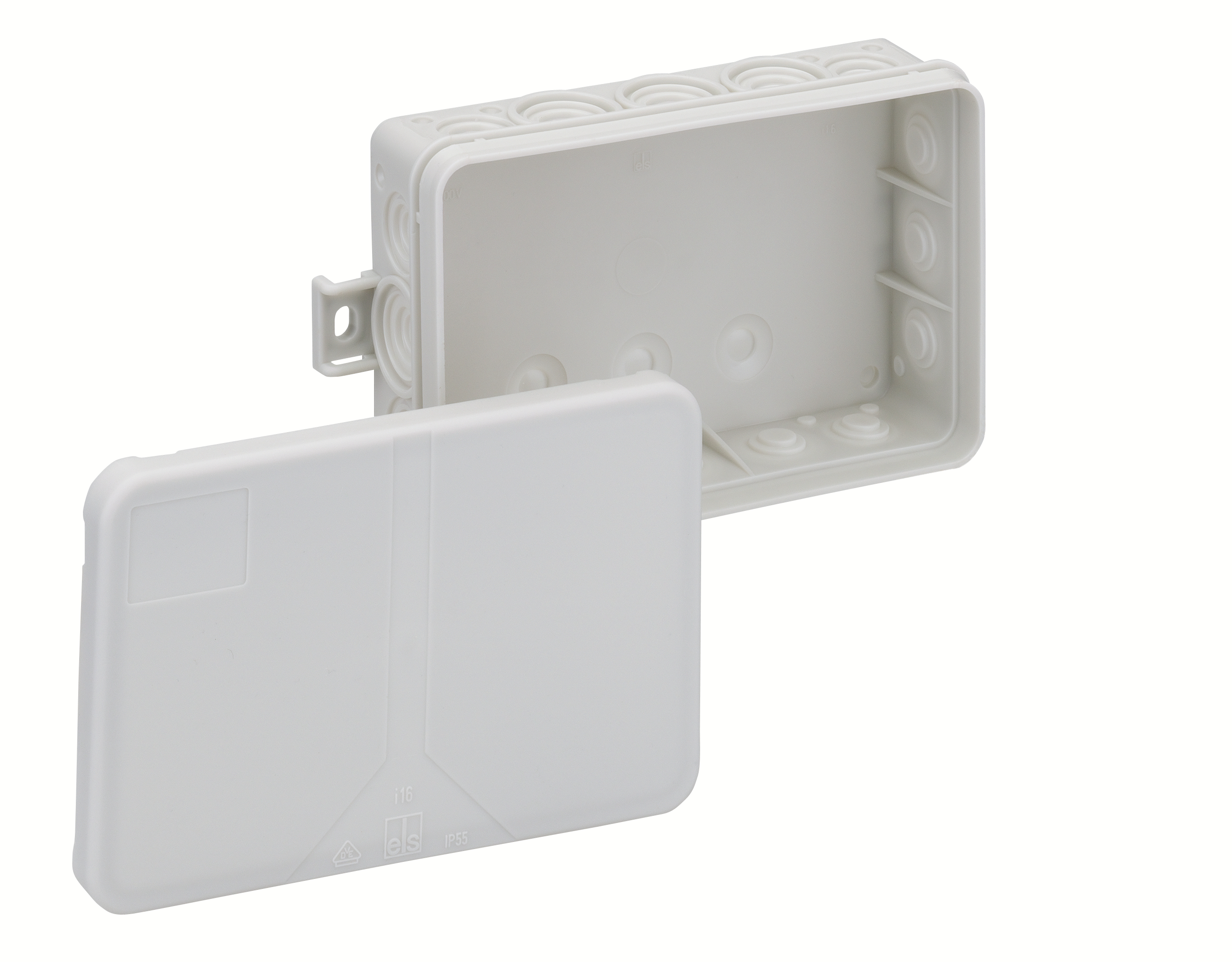 Abzweigdose, mit Schutzart IP55, Nennquerschnitt 2,5mm², Ui=400 V AC, zertifiziert durch VDE (DIN EN 60670-1/-22 (VDE 0606-1/-22)), selbstdichtende Einführungsmembranen, Dichtbereich 8,2-12,5mm, (3 rückseitig, 16 seitlich), außenliegende Befestigungsstellen, für Standardinstallationen im Innenbereich, grau, ohne KlemmenAbmessungen: 130 x 85 x 37mm