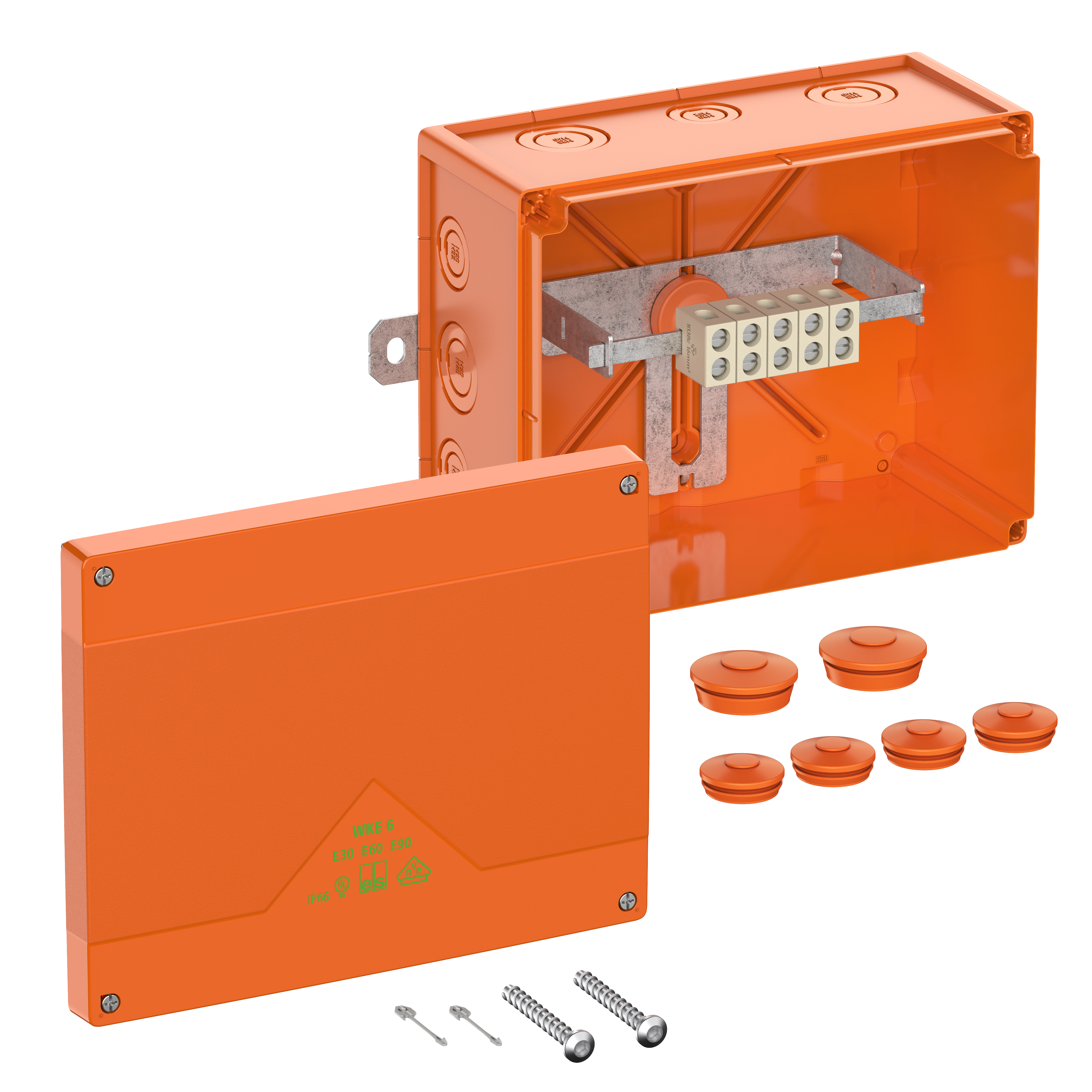 Abzweigkasten, mit Schutzart IP66, Ui=450 V AC, zertifiziert durch VDE (DIN EN 60670-1/-22 (VDE 0606-1/-22)), UL-EU (EN 62208), Ausschlagmembranen, M20/M25/M32/M40, (4 rückseitig, 12 seitlich), außenliegende Befestigungsstellen, mit elektrischem Funktionserhalt E30-E90 nach DIN 4102 Teil 12. Halogenfreies Gehäuse aus Spezialthermoplast, Klemmen aus hochtemperaturbeständiger Spezialkeramik, Klemmenhalter frei positionierbar, orange, Verbindungskasten 5-polig 1,5-16mm², Abzweigkasten 5-polig 1-6mm², Anzahl der klemmbaren Leiter pro Pol: 10 x 1,5² / 8 x 2,5² / 4 x 4² / 4 x 6² / 2 x 10² / 2 x 16²Abmessungen: 200 x 250 x 120mmBeigefügtes Zubehör: Deckelverliersicherung, Schraubanker, 4 Doppelmembranstutzen IP66 M32 Dichtbereich 13-21mm, 2 Doppelmembranstutzen IP66 M40 Dichtbereich 17-28mm