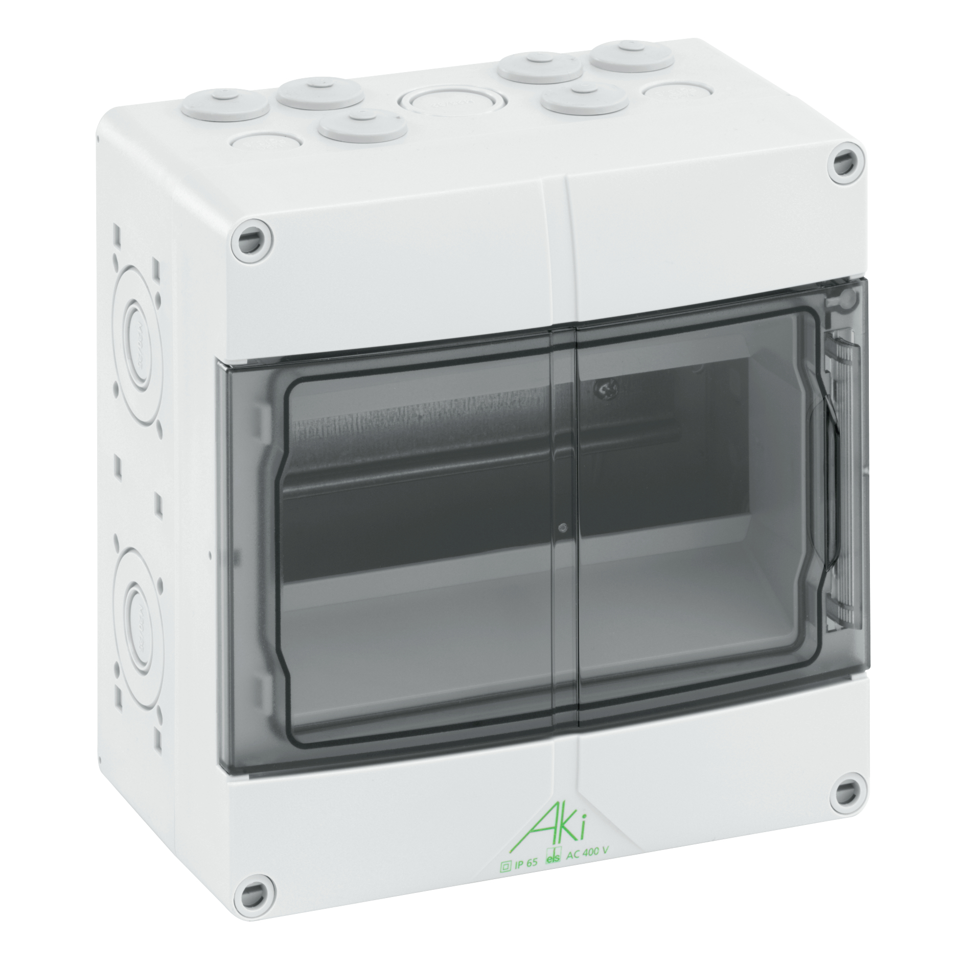 Kleinverteiler, mit Schutzart IP65, 1-reihig, 9 verfügbare Teilungseinheiten, Bemessungsbetriebsspannung: 400V AC, Bemessungsisolationsspannung: 1000V AC, 1000V DC, oben und unten metrische Vorprägungen für universelle Leitungseinführungen mit Kabelverschraubungen und / oder Doppelmembranstutzen, oben mit elastischen Einführungen DMS M20 vorbestückt, für die Installation im industriellen Umfeld und im geschützten Außenbereich, mit PE/N-Klemmschiene mit jeweils 2 Klemmstellen 16mm² und 5 Klemmstellen 6mm²Abmessungen: 200 x 200 x 122mmBeigefügtes Zubehör: Doppelmembranstutzen: 1x M20, 1x M32, Verschlussstopfen, Abdeck- und Beschriftungsstreifen