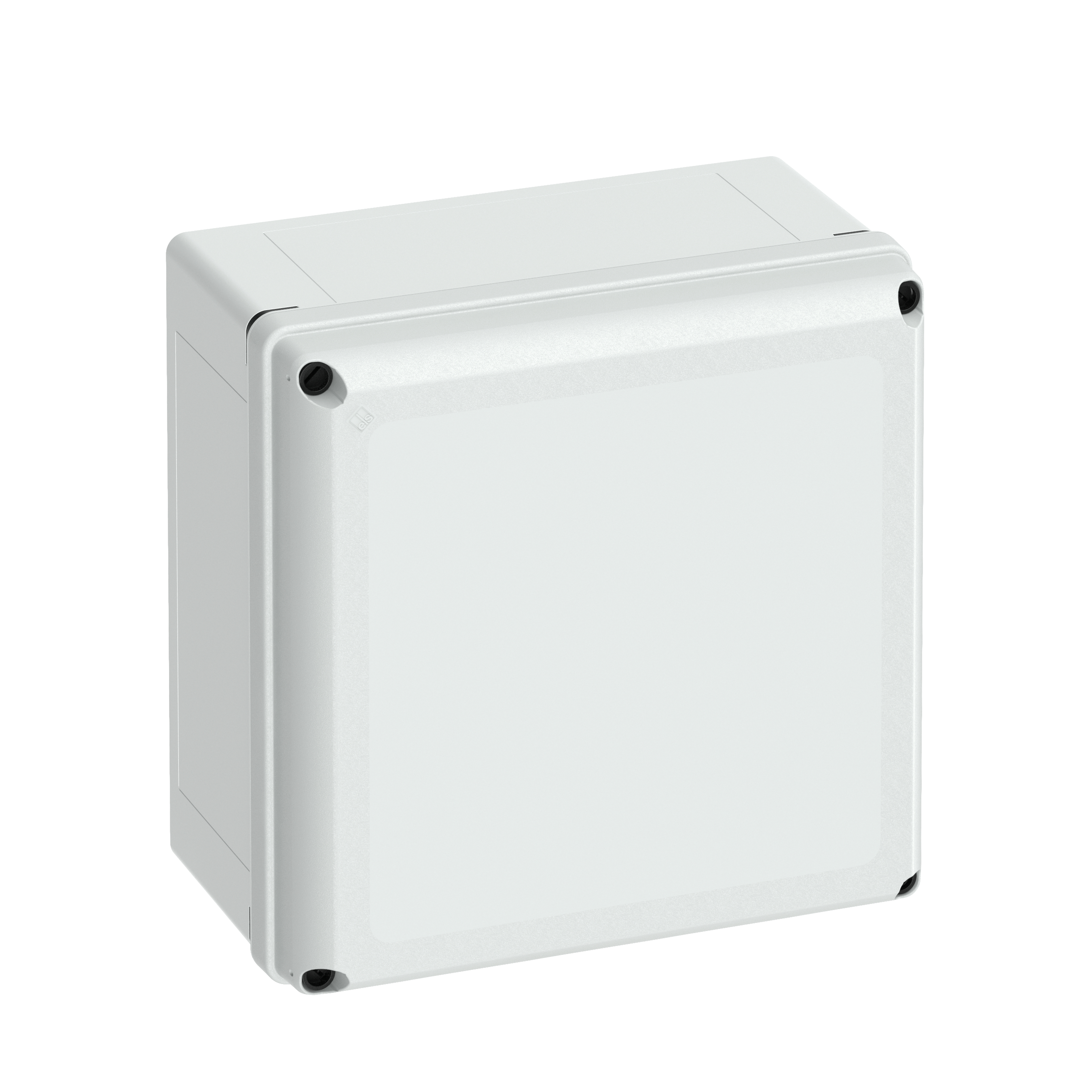 Leergehäuse, geeignet für die Installation in rauen Umgebungen und im ungeschützten Außenbereich, Kasten: glasfaserverstärktes Polycarbonat, grau, ähnlich RAL 7035, Deckel: Polycarbonat, mit grauem DeckelAbmessungen: 300 x 300 x 180mm