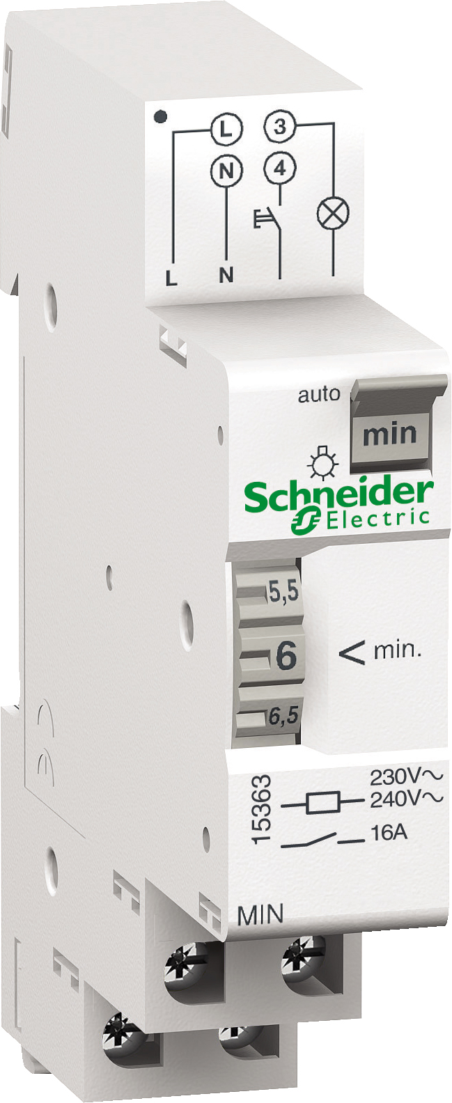 Acti9 MIN elektromechanische Treppenlichtzeitschalter. Zwei Betriebsarten > Automatik oder Handbetrieb, umschaltbar über den frontseitigen Kippschalter. eingestellt werden:. Breite von 1 TE entspricht 18mm. Schließen und anschließendes Öffnen eines Kontakts in einer bestimmten Zeit. Einstellbare Einschaltdauer von 1 - 7 Minuten. Einstellung über Rändelrad in Schritten à 15 Sekunden. Durch erneutes betätigen eines Tasters kann die Zeit nachgeschaltet werden. Schalten des Treppenlichtzeitschaltuhr mit Standard- oder 230V-Leuchttastern. Vorrangiger Handbetrieb - Dauerbeleuchtung möglich. Anschlussmöglichkeit über 3- oder 4-Leiter möglich, seitlich umstellbar.