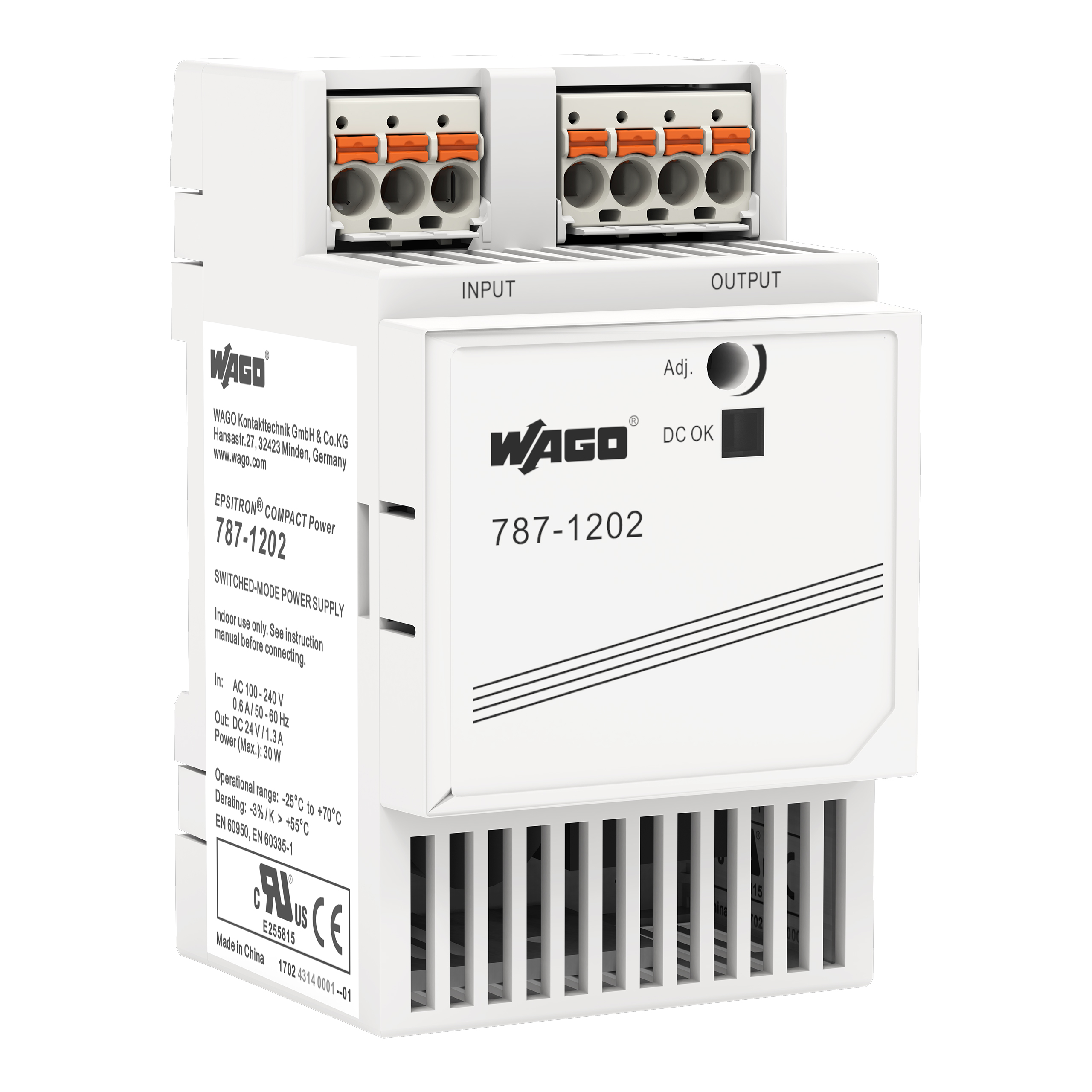 Primär getaktete Stromversorgung Compact 1-phasig Ausgangsspannung DC 24 V Ausgangsstrom 1,3 A DC-OK LEDMerkmale: Primär getaktete Stromversorgung. Stufenprofil für normgerechten Einbau im Installationsverteiler. Abnehmbare Frontplatte und Schraubvorrichtungen optimal für alternativen Einbau im Systemverteiler oder Geräteeinbau. Steckbare picoMAX®-Anschlusstechnik (werkzeugfrei). Parallelschaltbar, reihenschaltbar. Galvanisch getrennte Ausgangsspannung (SELV) gemäß EN 60335-1 und UL 60950-1 PELV gemäß EN 60204.