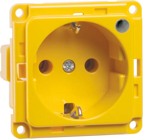 Steckdose SCHUKO mit Kontroll-Licht LED, mit gelber Abdeckung und gelbfarbenem Sockel 2-polig, 16 A 250 V, mit Steckklemmen, mit grüner LED als Spannungsanzeige, 230 V/1mA, LED-Lebensdauer ca. 10 Jahre, mit Abdeckung für Frontbefestigung, erhöhter Berührungsschutz gemäß VDE 0620