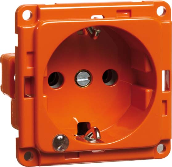 Steckdose SCHUKO mit Kontroll-Licht LED, mit orangefarbener Abdeckung und orangefarbenem Sockel 2-polig, 16 A 250 V, mit Steckklemmen, mit grüner LED als Spannungsanzeige, 230 V/1mA, LED-Lebensdauer ca. 10 Jahre, mit Abdeckung für Frontbefestigung, erhöhter Berührungsschutz gemäß VDE 0620