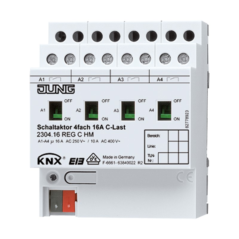 mit Stromerkennung REG-Gehäuse 4 TE 4 Schließer mit mechanischer Handbetätigung und Statusanzeige Die volle Funktionalität wird ab ETS3.0d oder höher unterstützt. ETS-Produktfamilie Ausgabe Produkttyp Binärausgang 4fach Bestimmungsgemäßer Gebrauch Schalten elektrischer Verbraucher AC 110 ... 230 V oder AC/DC 24 V mit potentialfreien Kontakten Montage auf Hutschiene nach DIN EN 60715 in Unterverteiler Produkteigenschaften Manuelle Betätigung der Relais unabhängig vom Bus Schließer- oder Öffnerbetrieb Logische Verknüpfung und Zwangsführung Rückmeldung Schalten (nur Busbetrieb) Schaltstellungsanzeige Zentrale Schaltfunktion mit Sammelrückmeldung Sperrfunktion für jeden Kanal Zeitfunktionen: Ein-, Ausschaltverzögerung, Treppenlichtschalter mit Abschaltwarnung Einbindung in Lichtszenen Betriebsstundenzähler, über Bus konfigurierbar Eingangsüberwachung auf zyklische Aktualisierung mit Sicherheitsschaltung Keine zusätzliche Stromversorgung erforderlich Stromerkennung: Messung des Laststroms für jeden Ausgang Überwachen von Schwellwerten zur Lastüberwachung, z.B. für Meldung Lastausfall Schalten kapazitiver Lasten und dadurch bedingte hohe Einschaltströme