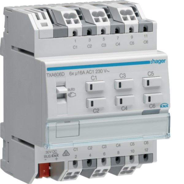Schalt-/Jalousieaktor 6/3-fach KNX easy, 16 Ampere, C-Last: Reiheneinbaugerät für das Schalten von Lasten oder Ansteuerung von Jalousieantrieben. Ermöglicht Mixbetrieb aus Antriebs- und Schaltfunktionen. Ausgestattet mit QuickConnect Steckklemmen, integriertem Busankoppler und Bedientaste mit Status-LED. Bietet Funktionen wie Zeitschalter, Zwangssteuerung, 64 Szenen pro Kanal und Sonnenschutzfunktion. Programmierbar via ETS ab Version 4.
