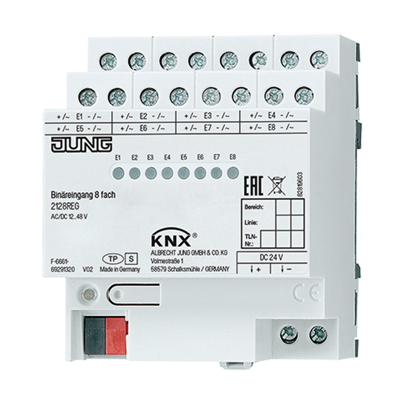 REG-Gehäuse 4 TE 8 Eingänge 12 ... 48 V AC/DC Hilfsspannungsausgang DC 24 V (SELV) zur Abfrage potentialfreier Kontakte mit Statusanzeige ETS-Produktfamilie Eingabe Produkttyp Binäreingang 8fach Bestimmungsgemäßer Gebrauch Abfrage konventioneller Schalt- oder Tastkontakte, Fensterkontakte etc. in KNX-Anlagen zum Melden von Zuständen, Zählerständen, Bedienen von Verbrauchern etc. Montage auf Hutschiene nach DIN EN 60715 in Unterverteiler Produkteigenschaften Status-LED für jeden Eingang Erkennen von Spannungspegeln und -wechseln am Eingang Senden des Eingangszustandes auf den Bus Sendeverhalten frei einstellbar Funktionen: Schalten, Dimmen, Jalousien auf/ab, Helligkeitswerte, Temperaturen, Abrufen und Abspeichern von Szenen Eingänge separat sperrbar Anschluss externer Wechsel- und Gleichspannungen möglich- Hersteller-Artikelnummer (MPN)