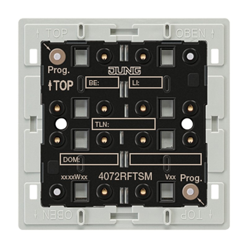 für Tastensatz 2fach, Art.-Nr.: .. 402 TSA .. für Taste 2fach mit Symbolen, Art.-Nr.: .. 402 TSAP .. inklusive Montageplatte, Klebefolie und Befestigungsschrauben ETS-Produktfamilie Taster Produkttyp Taster 2fach 2 rote LEDs: Aktorstatus 1 blaue LED: Übertragungsstatus Bestimmungsgemäßer Gebrauch Funkgebundenes Bedienen von Verbrauchern, z.B. Licht ein/aus, Dimmen, Jalousien auf/ab, Helligkeitswerte, Abrufen und Abspeichern von Lichtszenen Betrieb in leitungsgebundenen KNX-Anlagen über Medienkoppler (Art.-Nr.: MK 100 RF) Montage auf Gerätedose mit Abmessungen nach DIN 49073, Schraubbefestigung auf Wänden oder Klebemontage auf glatten Flächen (Glasscheiben) Produkteigenschaften Tastsensor-Funktionen Schalten, Dimmen, Jalousiesteuerung, Wertgeber, Szenenaufruf etc. Tastenpaare für Tast- oder Wippenfunktion Statusanzeige mit LED Batteriebetriebenes Gerät Projektierung und Inbetriebnahme mit ETS5 oder neuer Nicht mit Rahmen aus dem FLAT DESIGN kombinierbar.- Hersteller-Artikelnummer (MPN)