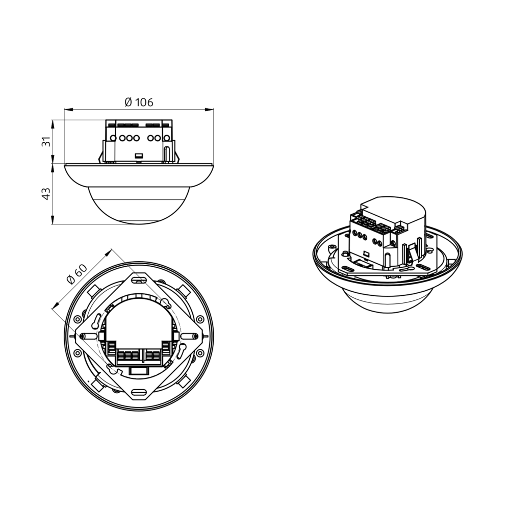Präsenzmelder mit großem Erfassungsbereich, Ein Kanal zum Schalten von Licht, Ein zusätzlicher potentialfreier Kontakt für HKL, Ausführung als Master-Gerät, Erweiterung des Erfassungsbereiches mit Slave-Geräten möglich, Manuelles Schalten über Taster möglich, Weitere Funktionen über optionale Fernbedienung einstellbar, Alarmimpuls: Auslösen erst bei drei erkannten Bewegungen innerhalb von 9 Sekunden, Werkseinstellung 10 min und 500 Lux (15 min HKL), Schaltung im Nulldurchgang
