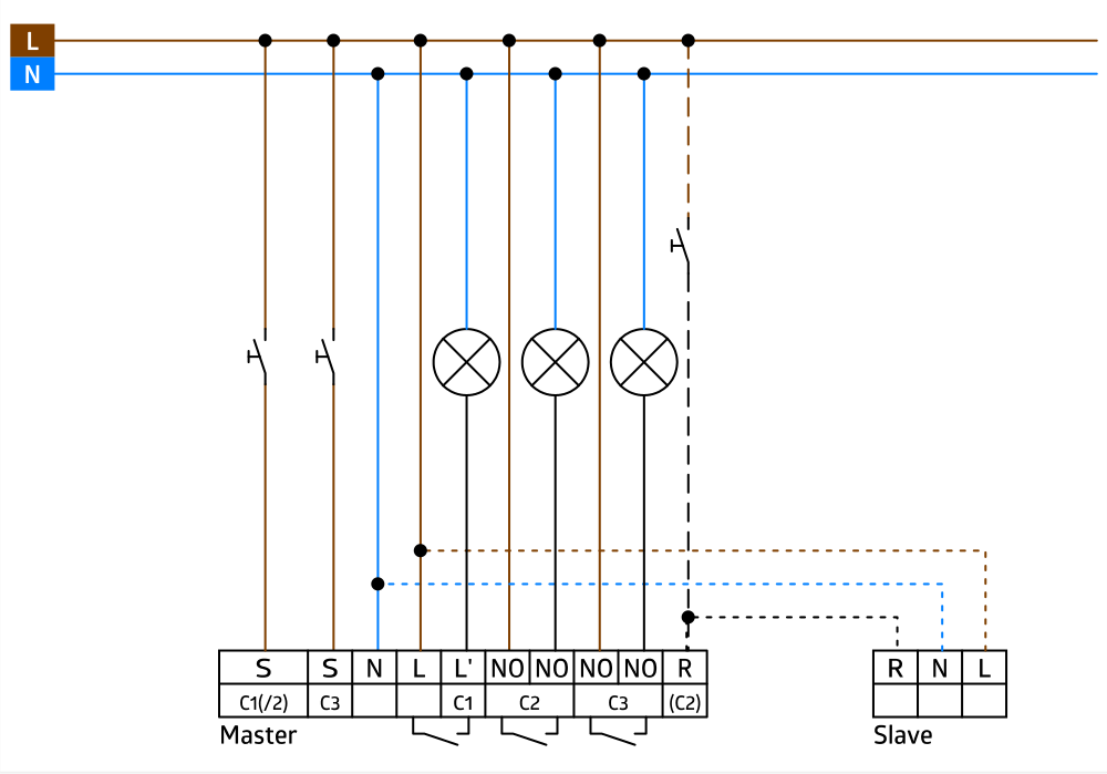 Präsenzmelder speziell für Klassenzimmer und Schulungsräume, Ein potentialfreier und ein potentialbehafteter Kontakt für zwei Lichtgruppen, wahlweise getrennt schaltbar, Ein potentialfreier Kontakt für Tafelbeleuchtung oder HKL, Ein gemeinsamer Erfassungsbereich, Zwei unabhängige, bewegliche Lichtfühler, Manuelles Schalten wahlweise über zwei bzw. drei Taster möglich, Ausführung als Master-Gerät, Erweiterung des Erfassungsbereiches mit Slave-Geräten möglich, Weitere Funktionen über optionale Fernbedienung einstellbar, Relais mit Wolfram-Vorlaufkontakt, optimiert für LED-Lasten