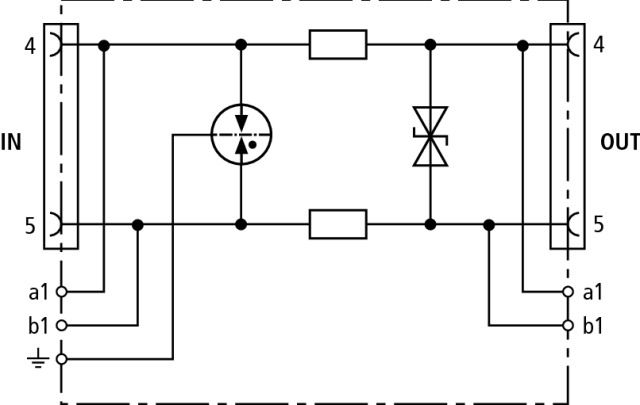 Energetisch koordinierter leckstromfreier Überspannungsableiter für a/b-Ader, ISDN Uk0 oder ADSL mit RJ45-Anschlüssen und zusätzlichen Schraubklemmenanschlüssen. Das Pinning der RJ45-Buchsen ist RJ11/12-kompatibel. Die parallelen Schraubklemmen sind robuster als die RJ45-Buchsen und erhöhen den Nennableitstoßstrom gesamt auf 10 kA.