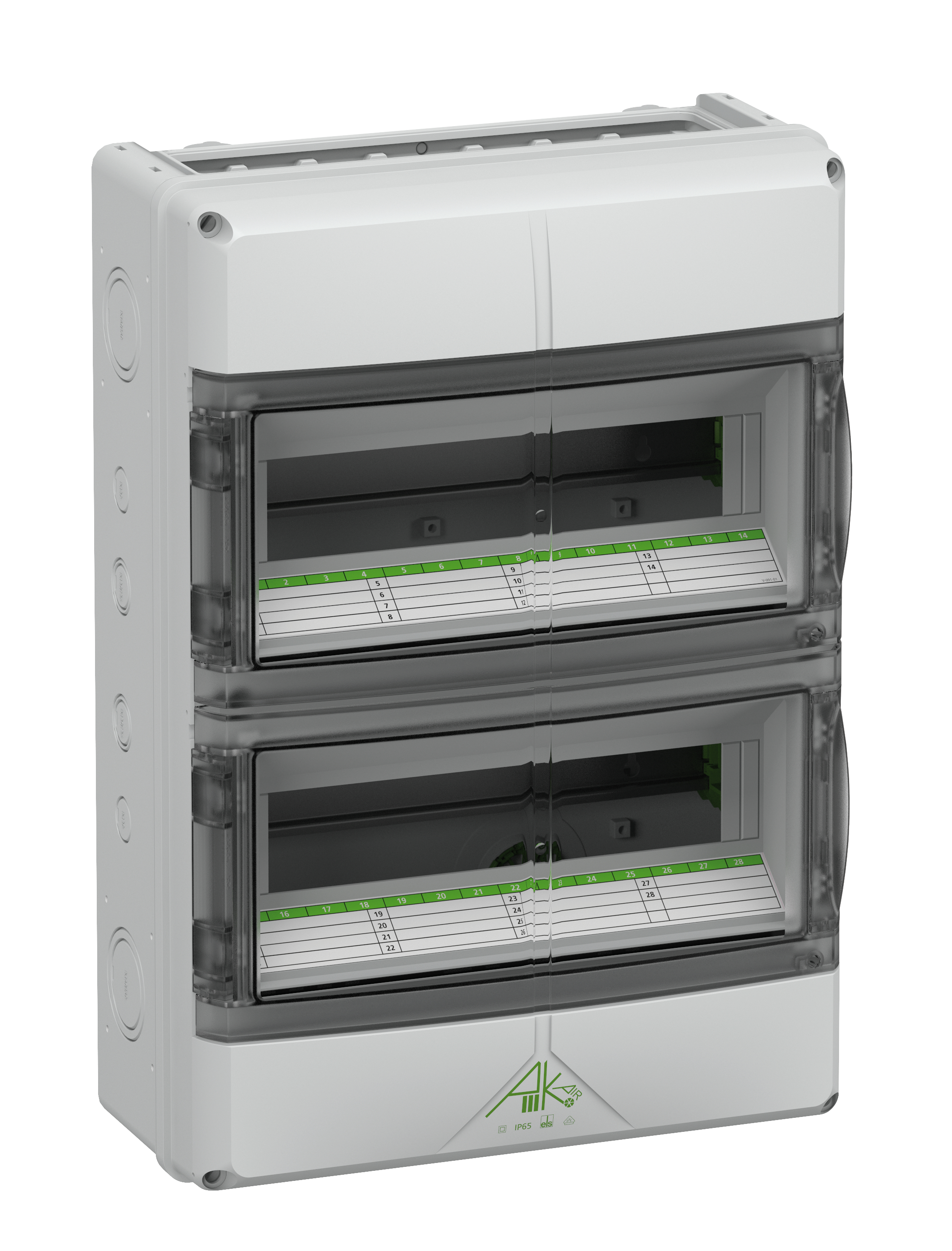 Kleinverteiler, mit Schutzart IP65, 2-reihig, 28 verfügbare Teilungseinheiten, Flansch-Type, mit integrierten Belüftungselementen zur Verminderung der Kondenswasserbildung, Bemessungsbetriebsspannung: 400V AC, Bemessungsisolationsspannung: 1000V AC, 1500V DC, zertifiziert durch VDE (DIN EN 60670-1/-24 (VDE 0606-1/-24)), UL-EU (EN 62208), UL-EU (EN 61439-1/-2), UL-EU (EN 61439-1/-3), UL-EU (EN 61439-1 & EN IEC 61439-7), DLG (Ammoniakbeständigkeit), oben und unten offene Stirnflächen zur Montage von verschiedenen Flanschen oder zur Kombination mehrerer AK-F Gehäuse mittels Kombiflansch, für die Installation im industriellen Umfeld und im geschützten Außenbereich, PE/N-Klemme, bestehend aus: PE-Klemmschiene mit 6 Schraubklemmen 2,5-16mm² und 21 Push-in-Klemmen 0,75-4mm², 3 N-Module (mit Steckbrücke verbunden) mit jeweils 2 Schraubklemmen 2,5-16mm² und 6 Push-in-Klemmen 0,75-4mm² mit Betätigungshebel zum werkzeuglosen Lösen der LeiterAbmessungen: 315 x 450 x 155mmBeigefügtes Zubehör: Doppelmembranstutzen: 1x M16, 5x M20, 2x M25, 1x M32, 1x M40, Verschlussstopfen, Abdeck- und Beschriftungsstreifen