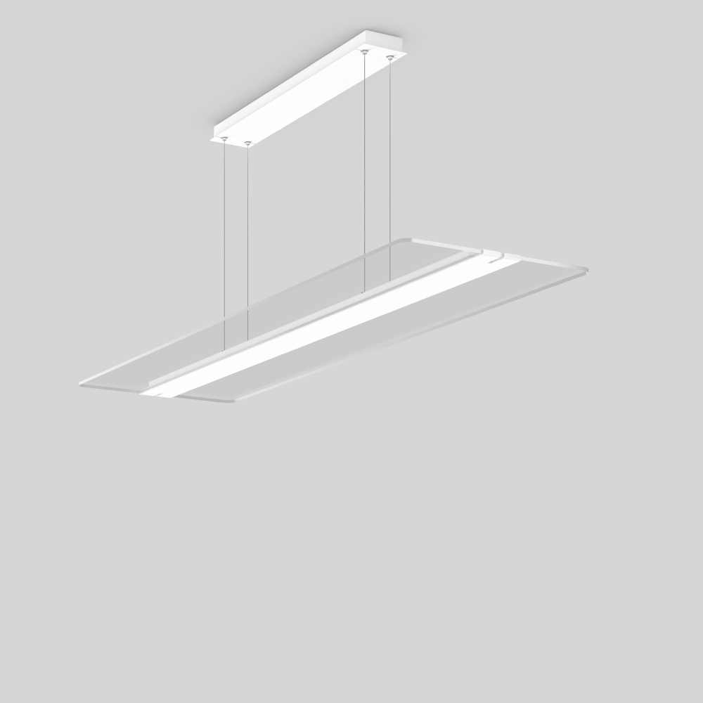 LED-Pendelleuchte mit extrem flachen und rahmenlosen Erscheinungsbild. Leuchtenmittelsteg aus Aluminium-Strangpressprofil, pulverbeschichtet. Transparenter Lightguide aus UV-stabilem Acrylglas (PMMA) mit TWINDOT-Prismatik. Lichtlenkung durch perfekt blendfreie TWINDOT-Technologie für angenehm sanftes Licht mit weichen Schatten. Gleichmäßig breite Lichtverteilung indirekt und direkt. Lichtaustritt direkt 55%, indirekt 45%. 4-Punkt Stahlseilabhängung stufenlos höhenverstellbar. Betriebsgerät im Baldachin (pulverbeschichtet weiß) integriert. Stromführung über Seilpendel.