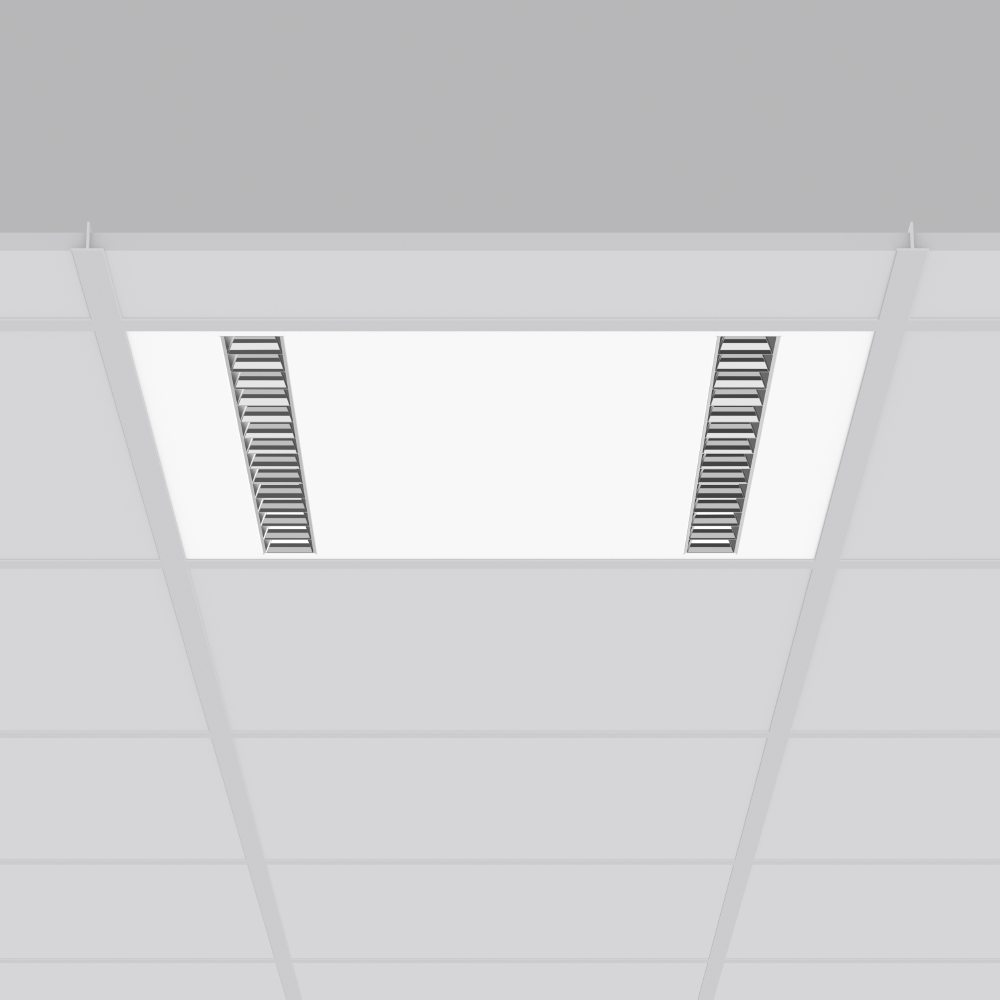 Hocheffiziente Einlegeleuchte für Deckensysteme mit sichtbaren Tragschienen. Gehäuse Metall pulverbeschichtet. Alea Optik System: Reflektorstruktur (ABS, Aluminium bedampft, hochglänzend) mit integriertem Diffusor aus vergilbungsfreiem Kunststoff (PMMA) opal für blendfreies Licht am Arbeitsplatz. Tiefstrahlende, brillante Lichtwirkung. Geeignet für Deckeneinlege. Betriebsgerät integriert. Hervorragend geeignet für Bürobereiche (RUG = 19) und Bildschirmarbeitsplätze (BAP) gem. DIN EN 12464-1.