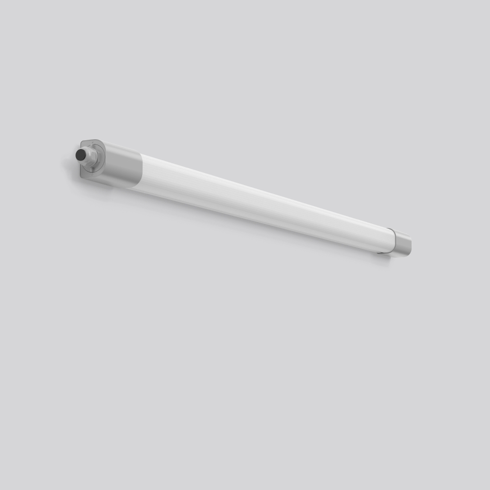 Feuchtraumleuchte mit schlanker und flacher Gehäuseform. Seitenteile Kunststoff (Polycarbonat) grau, schlagzäh. Diffusor aus Kunststoff (Polycarbonat) opal, schlagzäh. Diffusor extrudiert, innenprismatisch und UV-beständig. Lichtverteilung symmetrisch. Homogene Ausleuchtung. Rückwärtiger Lichtanteil zur Deckenaufhellung. Flexible Installation durch verschiebbare Montagebügel. Ideal bei Leuchtenaustausch. Deckenmontagebügel aus Edelstahl und Triangel-Bügel für Pendelmontage im Lieferumfang enthalten. Leuchte mit integrierter 4-poliger Durchgangsverdrahtung für das Aneinanderreihen von weiteren Leuchten. Komfortable Leitungseinführung über Kabelverschraubungen. Einfache Installation durch herausnehmbare Steckverbindung und Drehverschluss auf beiden Seiten. Austauschbare und herausnehmbare LED-Einheit mit integriertem Betriebsgerät. MultiLumen: Einstellbarkeit des Leuchtenlichtstroms in 2 Stufen. Werkseitig auf höchsten Leuchtenlichtstrom voreingestellt. Leuchte mit begrenzter Oberflächentemperatur nach DIN EN 60598-2-24 zur Verwendung in einer Umgebung, in der eine Ablagerung von leitfähigem Staub auf der Leuchte erwartet werden kann. Zugelassen für den Einsatz in der Lebensmittel, und Getränkeindustrie.