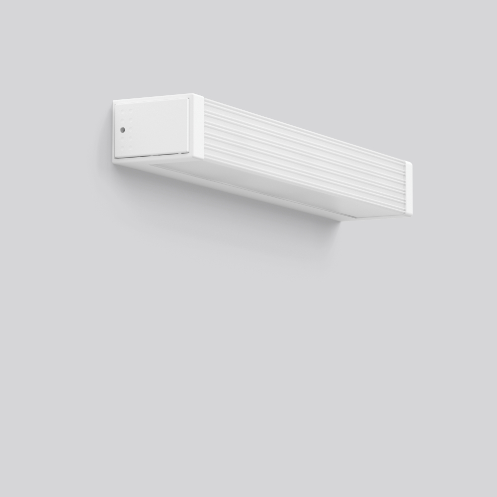 Linienleuchte als Wand, und Spiegelleuchte einsetzbar. Armatur Kunststoff. Endkappen Kunststoff. Mundgeblasenes Opalglas seidenglanz. Mit Druckschalter.