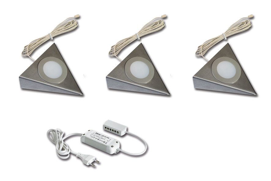 LED-Unterbauleuchte mit homogenem Flächenlicht als 3er Set, Gehäuse edelstahl, Anschlussleitung 2,5m mit LED 24-Stecker, Lichtfarbe warm weiß ca. 3000K, incl. steckerfertigem 15W Trafo, optionales Zubehör: Dimm-Controller mit Funkfernbedienung, 1-10V, DALI oder WiFi App zum Schalten und Dimmen.