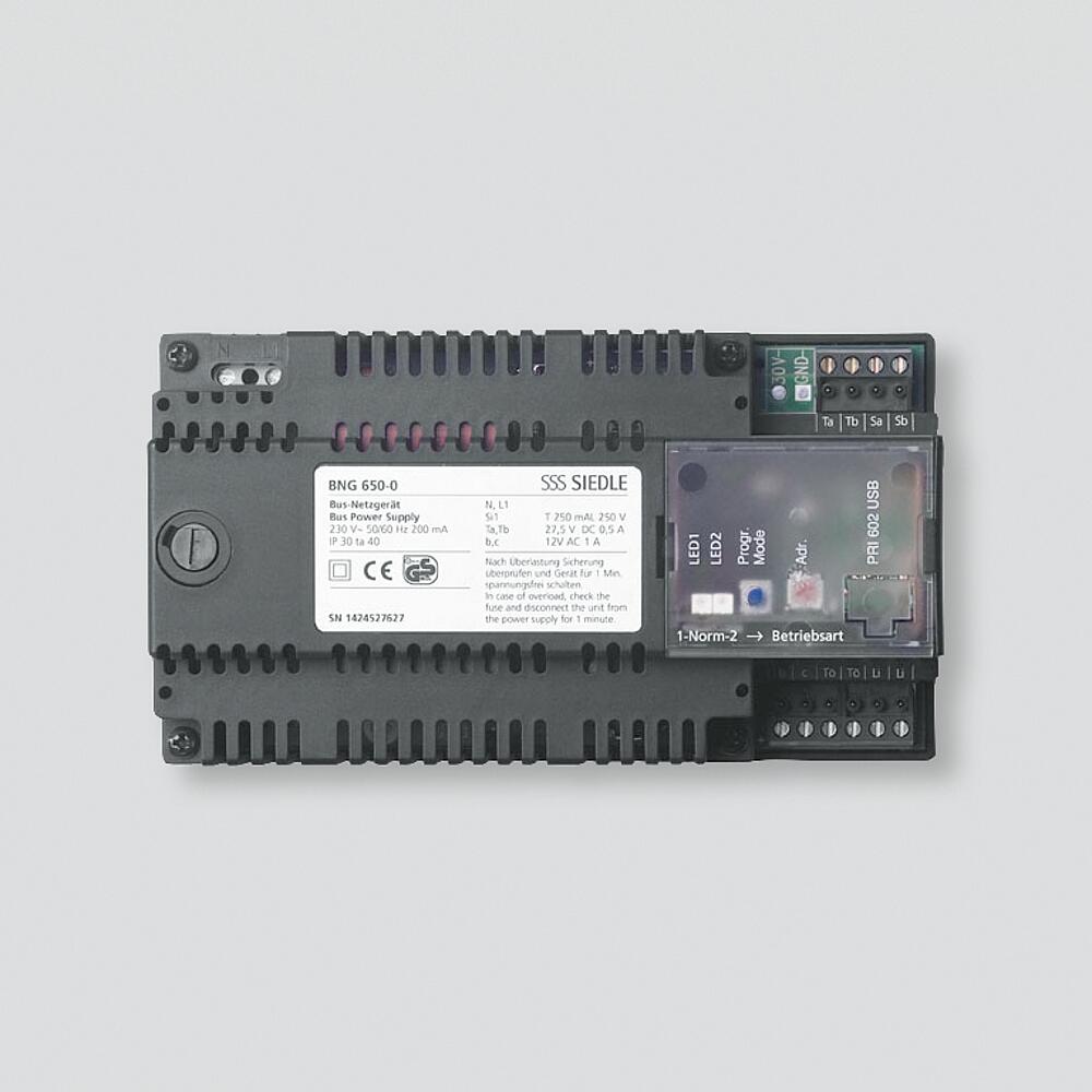 Bus-Netzgerät für den Siedle In-Home-Bus. Zur Versorgung und Steuerung der Bus-Teilnehmer Audio. Für Neu- und Bestandsanlagen mit max. 31 Teilnehmern pro Strang. Es sind bis zu 15 Stränge möglich.