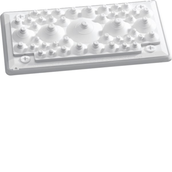 Der Leitungseinführungseinsatz univers mit IP55 bietet flexible Durchführungsoptionen für Kabel und Leitungen. Die Noppenstruktur ermöglicht ein einfaches Ausreißen für unterschiedliche Kabeldurchmesser, was eine schnelle und sichere Montage im Kopf- oder Fußteil des Schranks ermöglicht. Ideal für Umgebungen, die einen erhöhten Schutz gegen Umwelteinflüsse erfordern.