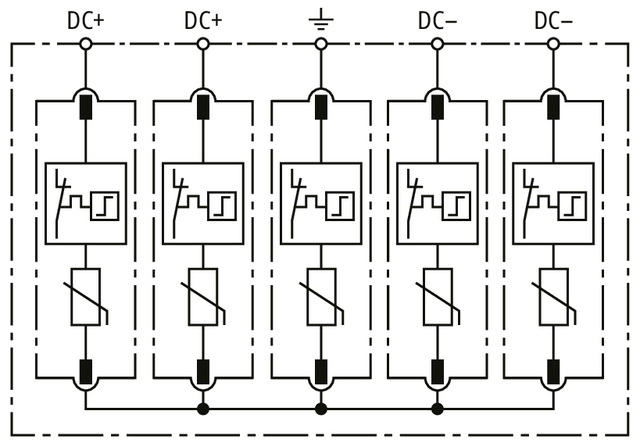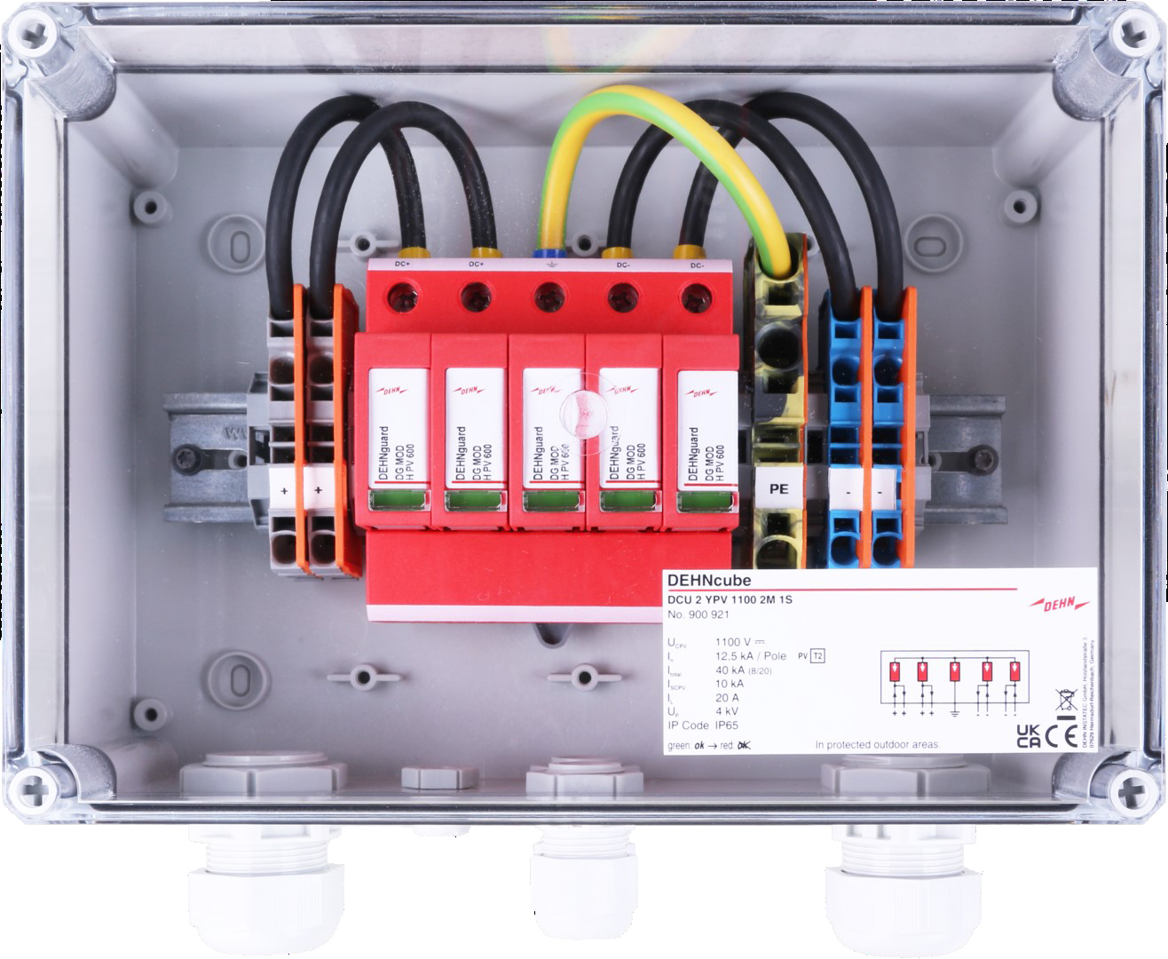 Generatoranschlusskasten DCU 2 YPV 1100 2M 1S in Schutzart IP65. Nach DIN EN IEC 61439-2 zum Schutz von zwei MPP-Eingängen und je einem String. Zum Einsatz gemäß DIN IEC 60364-7-712:2011-04 (Errichten von Photovoltaik-Versorgungssystemen).- Hersteller-Artikelnummer (MPN)