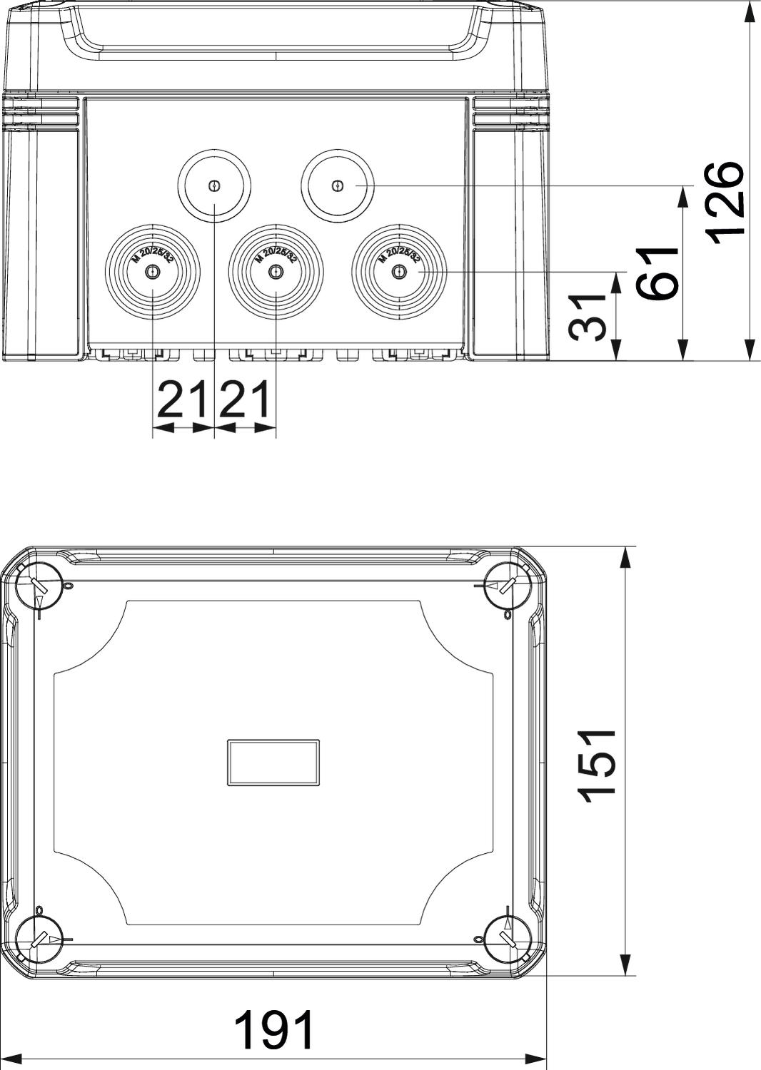 Kabelabzweigkasten zum Verbinden von Kabeln und Leitungen im Innen- und Außenbereich. Rechteckige Form mit Ausschlageinführungen. Geeignet für die Wand-/ Deckenmontage mit der Möglichkeit zur Außenbefestigung, Innenbefestigung oder Montage über die Eckdome. Besonders schlagfest mit IK09. Deckel mit Schnellverschluss, plombierbar. Hergestellt aus halogenfreien und UV-resistenten Materialien. Inklusive 5-poliger Hauptleitungsabzweigklemme, jede mit 2 x 25 mm² + 2 x 16 mm² Leiteranschlussquerschnitten pro Pol. Kabelabzweigkasten gemäß DIN EN 60670. Flammwidrig nach DIN EN 60695-2-11, Prüftemperatur 650°C. Schlagfestigkeit IK09 gemäß DIN EN 50102. Schutzart IP67 gemäß DIN EN 60529.- Hersteller-Artikelnummer (MPN)