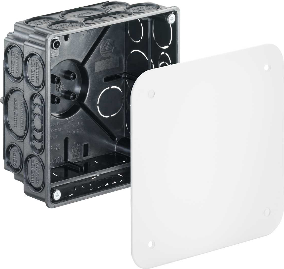Verbindungskasten mit Deckel, 107 x 107 x 57 mm, halogenfrei (1095-01). Unterputz-Verbindungskästen in allen Größen und für fast alle Aufgaben. Dieses Programm zeichnet sich durch seine praxisnahen Gehäusegrößen sowie die baustellengerechte, robuste Bauart der Gehäuse aus. Installationsart: Basis-Installation | Anwendungsgebiet: Für Leitungsverbindungen | Länge: 107 mm | Breite: 107 mm | Tiefe: 57 mm