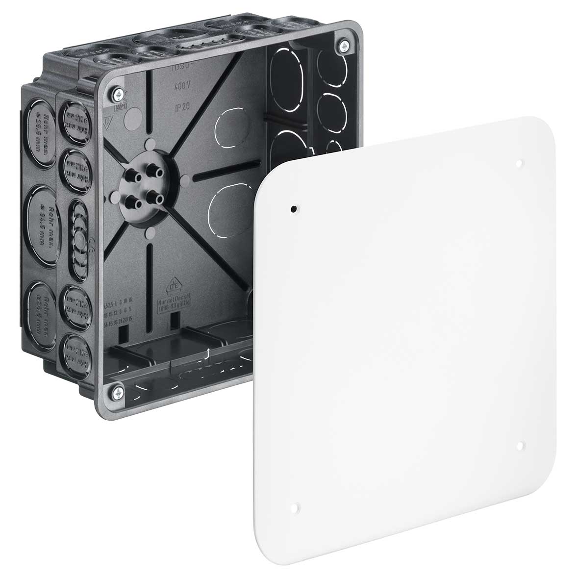 Verbindungskasten mit Deckel, 159 x 159 x 75 mm, halogenfrei (1096-01). Unterputz-Verbindungskästen in allen Größen und für fast alle Aufgaben. Dieses Programm zeichnet sich durch seine praxisnahen Gehäusegrößen sowie die baustellengerechte, robuste Bauart der Gehäuse aus. Installationsart: Basis-Installation | Anwendungsgebiet: Für Leitungsverbindungen | Länge: 159 mm | Breite: 159 mm | Tiefe: 75 mm