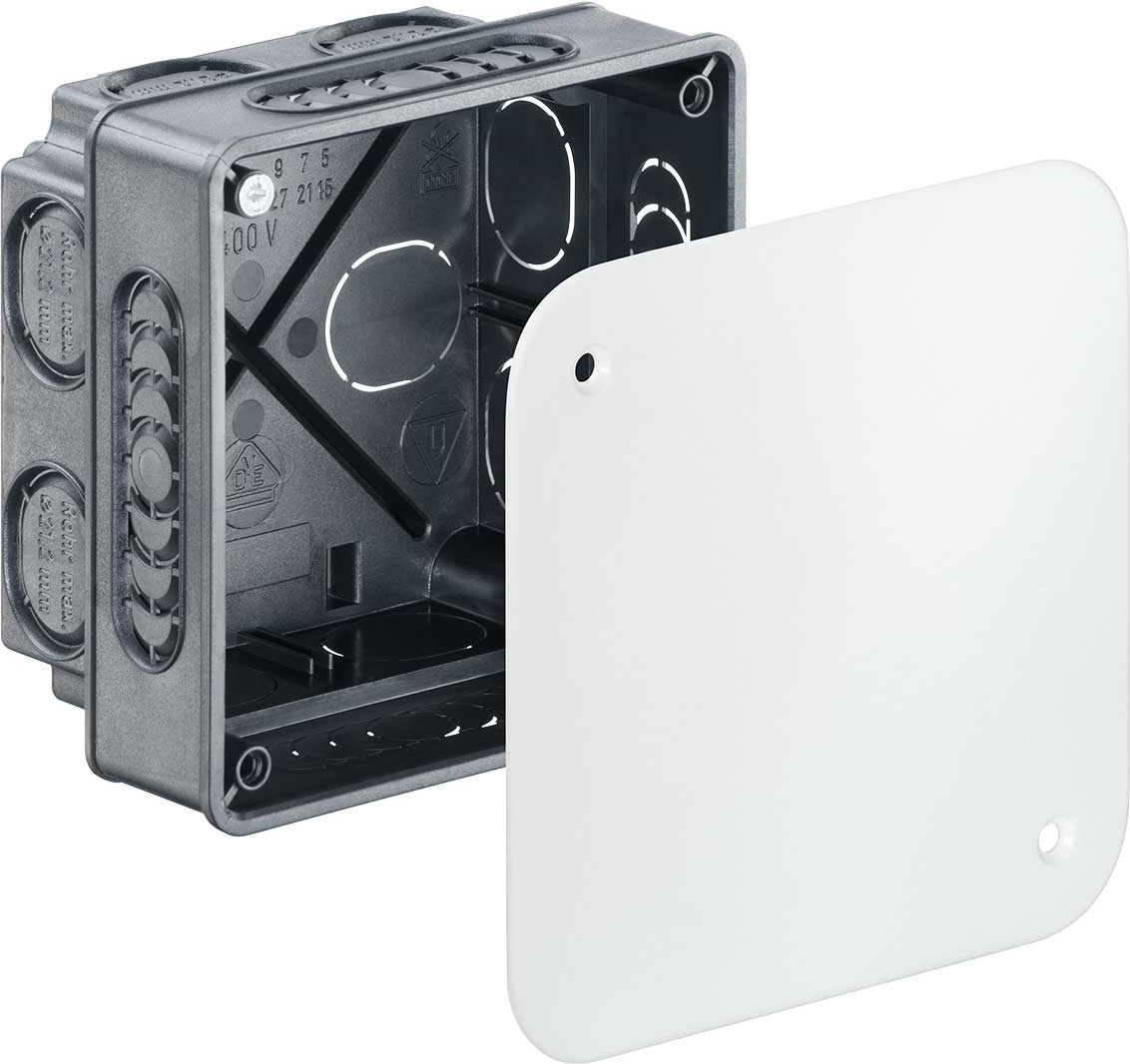 Verbindungskasten mit Deckel, 87 x 87 x 60 mm, halogenfrei (1094-01). Unterputz-Verbindungskästen in allen Größen und für fast alle Aufgaben. Dieses Programm zeichnet sich durch seine praxisnahen Gehäusegrößen sowie die baustellengerechte, robuste Bauart der Gehäuse aus. Installationsart: Basis-Installation | Tiefe: 60 mm | Anwendungsgebiet: Für Leitungsverbindungen | Länge: 87 mm | Breite: 87 mm