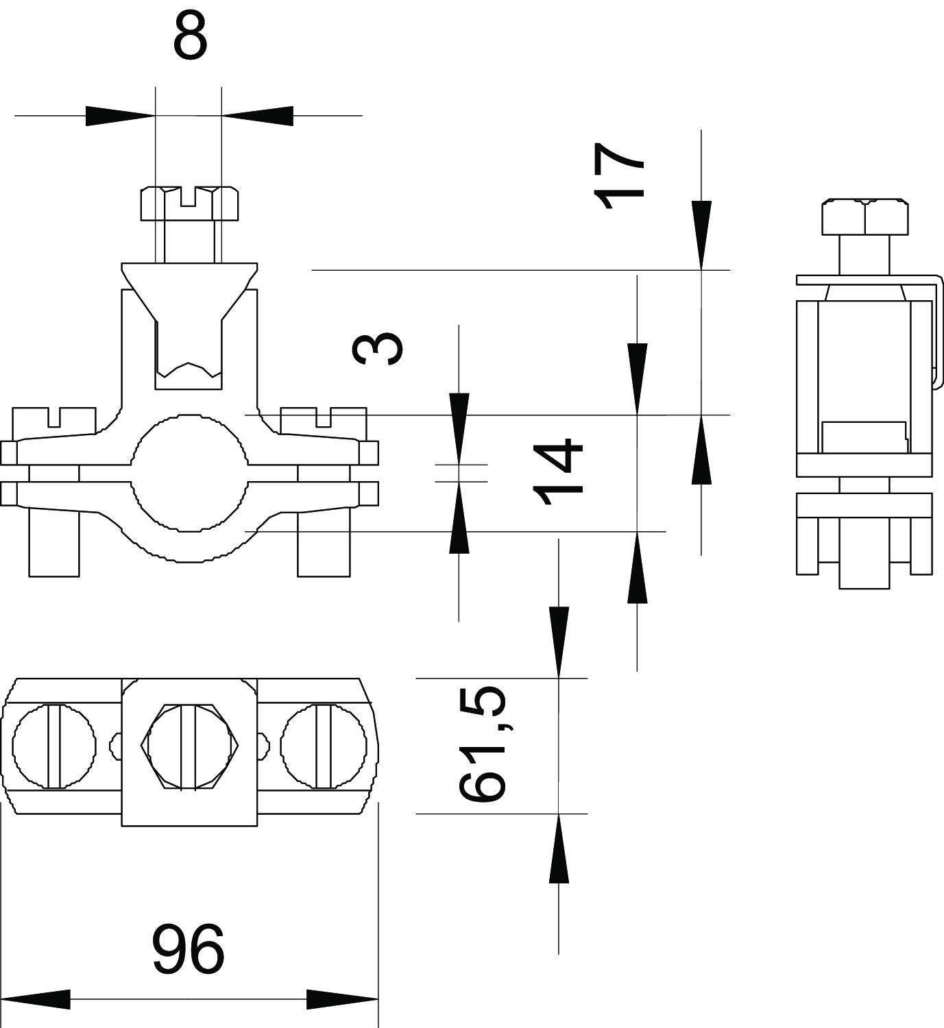 ; für Rohre von Ø 1/4 - 2 Zoll ; Anschlussmöglichkeiten: Leitungen bis 35 mm² oder Rundleiter bis Ø 6 mm ; mit unverlierbarer Druckleiste, 2 Zylinderschrauben M6 x 16 und 1 Sechskantschraube M6 x 16 aus Stahl, galvanisch verzinkt, Schellenoberteil und Unterteil aus Zinkdruckguss