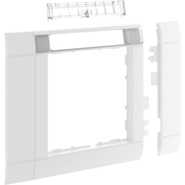 Rahmenblende 50 modular OT 80 halogenfrei mit Beschriftungsfeld verkehrsweiß.Rahmenblende für Brüstungskanal, modular anreihbar im Kombinationsabstand von 71 mm, Schnittkaschierend zum Kanaloberteil. Zur Aufnahme von Zentralscheiben, Abdeckungen, Wippen oder Adapterrahmen von Installationsschalterprogrammen mit Maß 50 x 50 mm. Angepasst an die Außenkontur des Brüstungskanals zur Reduzierung von Schmutzablagerungen und zur vereinfachten Reinigung. Zur Verwendung mit anreihbaren Gerätedosen für Brüstungskanäle, mit reduzierter Einbautiefe zum bündigen Abschluß mit der Verschlußkontur des Brüstungskanals. Über optionales Zwischenstück kombinierbar mit Steckdosenblende für Brüstungskanal. Integriertes Beschriftungsfeld zur Montage am Installationsgeräte oder der Gerätedose, kompatibel mit 9 mm Beschriftungsbändern.