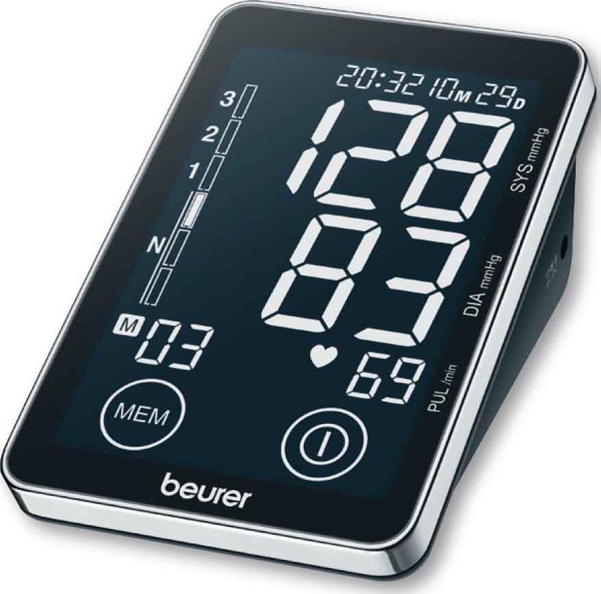 Touch Screen Display, 2x60 Speicher für 2 verschiedene Anwender, mit WHO-Indikator, Arrhythmie-Erkennung, extra großes, leicht ablesbares, beleuchtetes Schwarzdisplay 81x122 mm, Morgen- und Abendblutdruck, Manschettenhalter, Abschaltautomatik, Datum und Uhrzeit, Manschettengröße 22-30 cm, inkl. 4x1,5 V AA Batterien, Netzteiltauglich, PC-Link als Zubehör (USB-Schnittstelle), automatische Druckvorwahl und Luftablass, Batteriewechselanzeige, Meldung bei Anwendungsfehlern, Aufbewahrungstasche, Blutdruckpass, Abmessungen (LxBxH): 100x150x58 mm